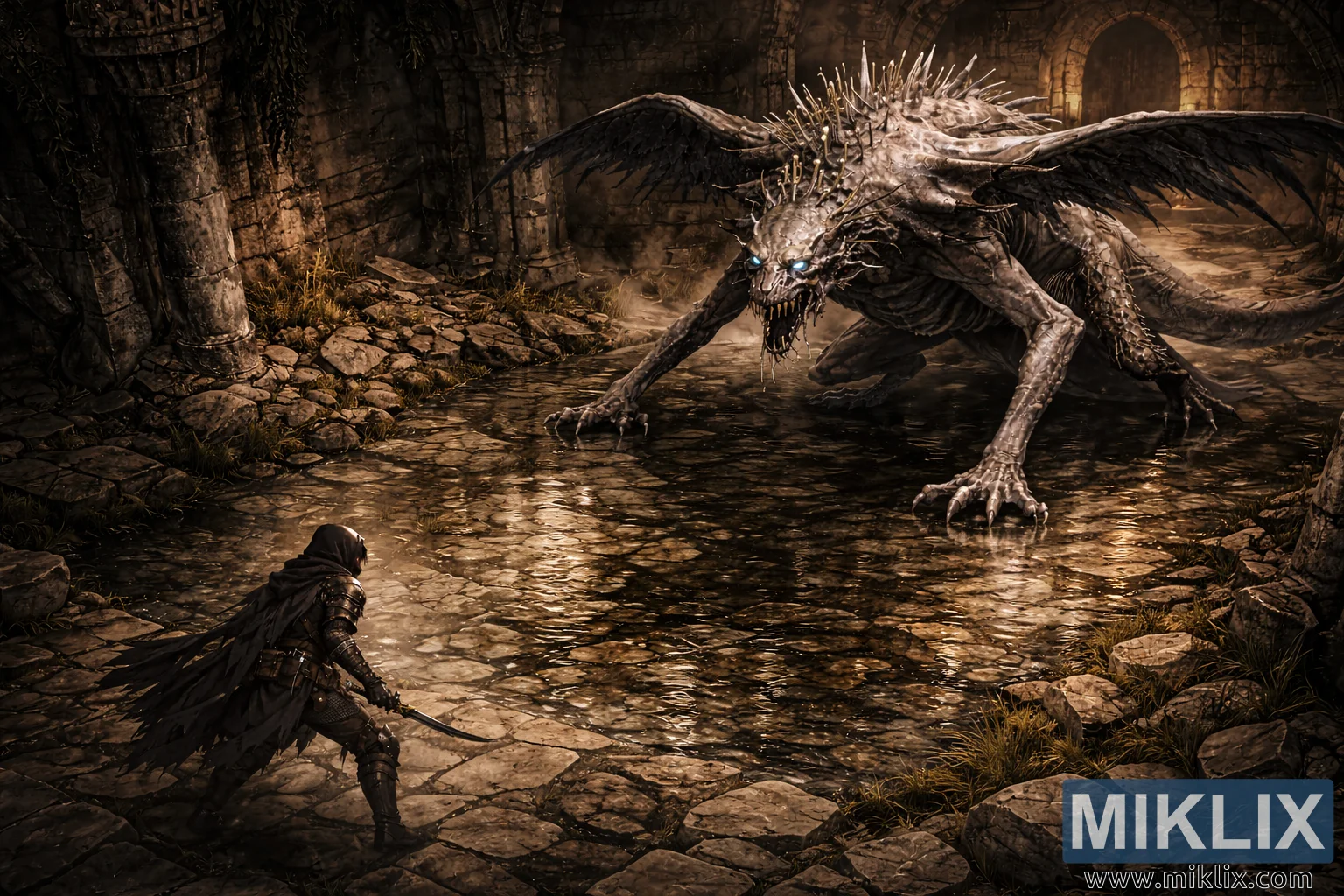Across the reflective pool dominating the center of the cathedral crouches a colossal dragon-like king whose immense size dwarfs both the warrior and the surrounding architecture. From the elevated angle, the viewer can fully appreciate the creature’s sprawling proportions: elongated limbs stretch outward like living pillars, claws partially submerged and sending faint ripples across the water’s surface. Its gaunt torso rises toward broken arches overhead, while vast ragged wings extend outward in a threatening span that nearly touches the ruined walls. Pale, desaturated skin clings tightly to sinewy muscle and protruding bone, giving the monster a skeletal yet powerful appearance. Jagged crystalline growths line its spine and shoulders, catching stray beams of warm light and producing cold glimmers that contrast with the environment’s earthy tones. The creature’s head lowers toward the warrior, jaws slightly parted to reveal rows of uneven teeth as thin strands of mist curl from its breath. Two piercing blue eyes glow intensely, radiating intelligence, menace, and predatory focus.