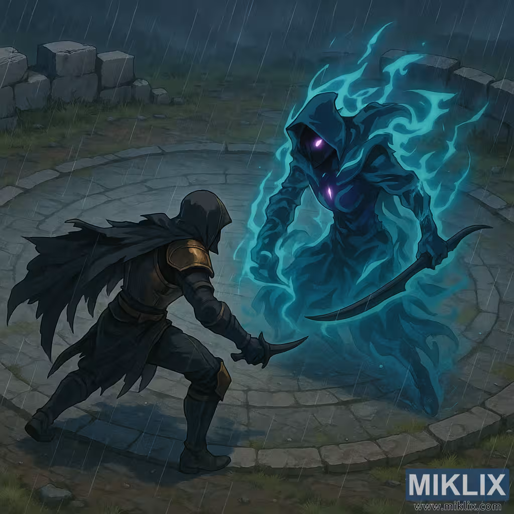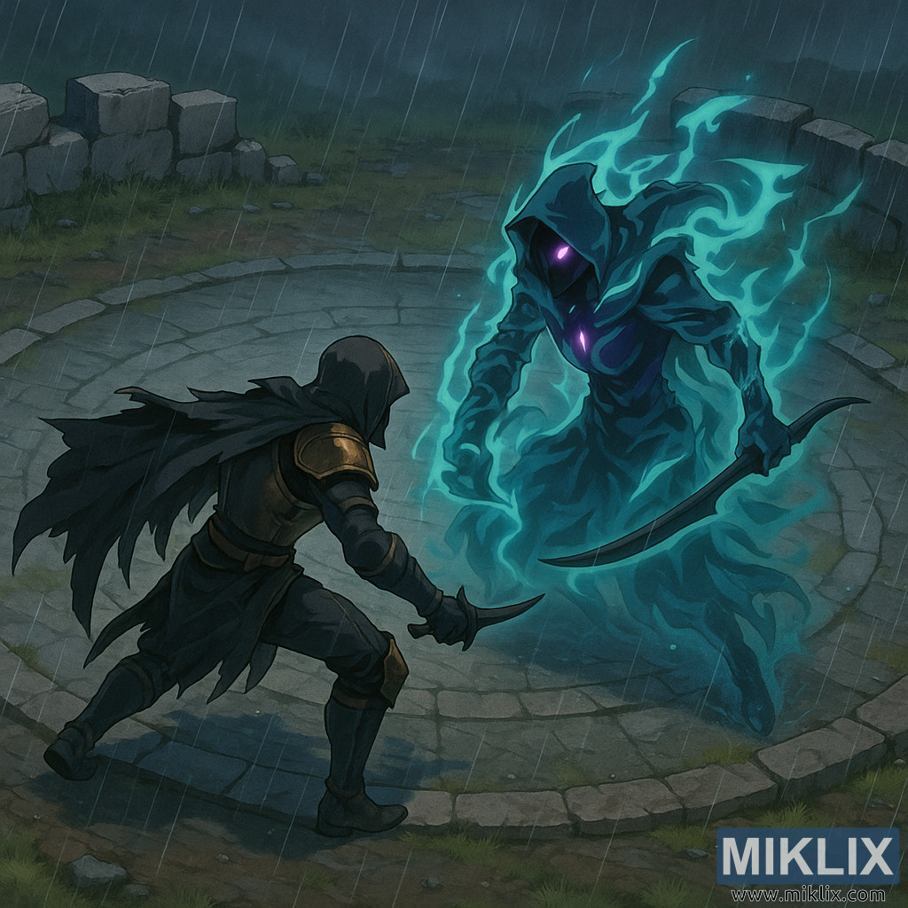 The isometric perspective enhances the tactical feel of the confrontation, allowing the viewer to clearly read the spacing between the two fighters and the geometry of the arena. The circular stone patterns subtly frame the combatants, guiding the eye toward the center of the duel. Cool blues and greens dominate the color palette, with the spectral teal of Alecto’s aura and the gray-blue rain-soaked stone setting the tone. These cool hues are punctuated by the warmer bronze accents of the Tarnished’s armor and the sharp violet glow of Alecto’s eye, creating visual tension that mirrors the narrative conflict. Overall, the image captures a moment of suspended violence and dread, presenting the duel not just as a clash of blades, but as a calculated, ritualistic confrontation between mortal resolve and supernatural assassination.