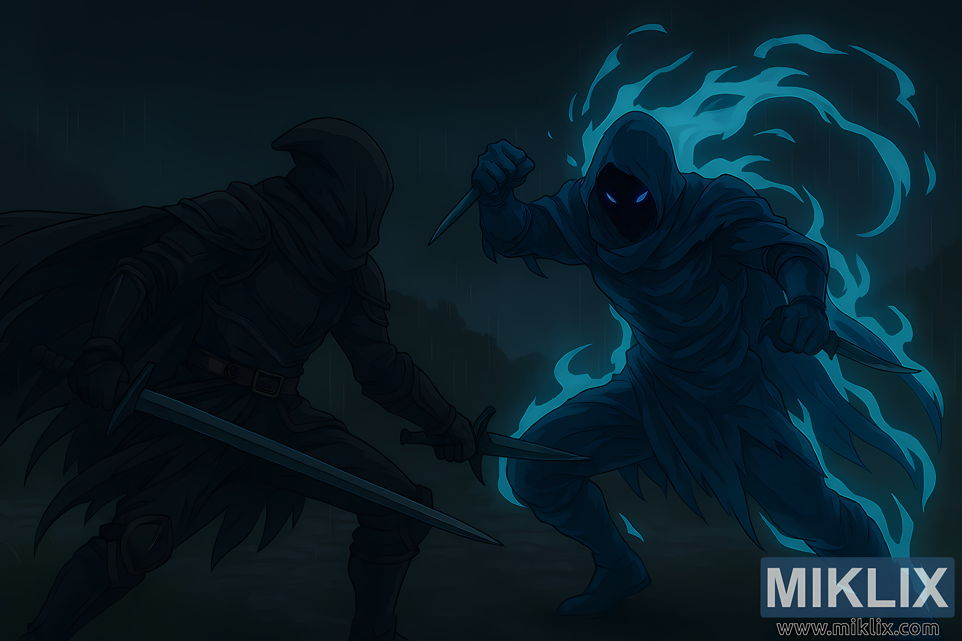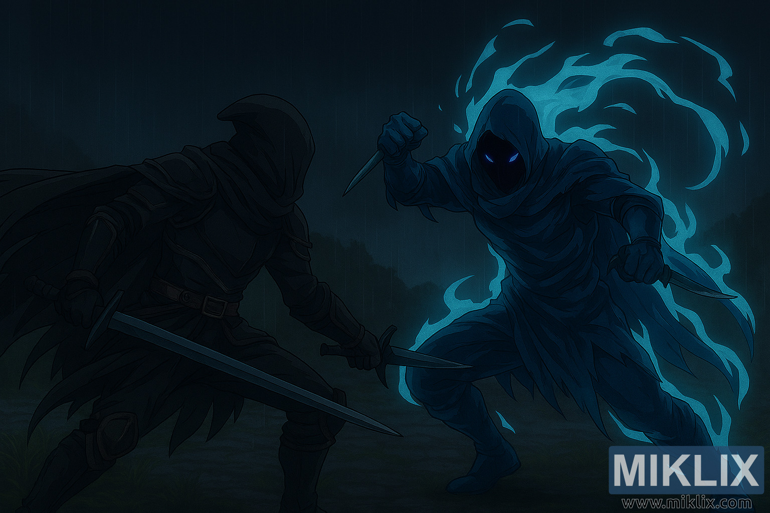 Opposite him, Alecto emerges from the shadows, her form enveloped in a swirling greenish-blue aura that pulses with ethereal energy. Her armor is sleek and jagged, designed for agility and lethal precision. Her hooded cloak billows behind her, and her glowing purple eyes pierce through the gloom. She wields two curved daggers, each etched with spectral runes and held in reverse grip, ready for rapid, deadly strikes. Her posture is aggressive and fluid, one foot forward and her body twisted in motion, as if caught mid-lunge.
