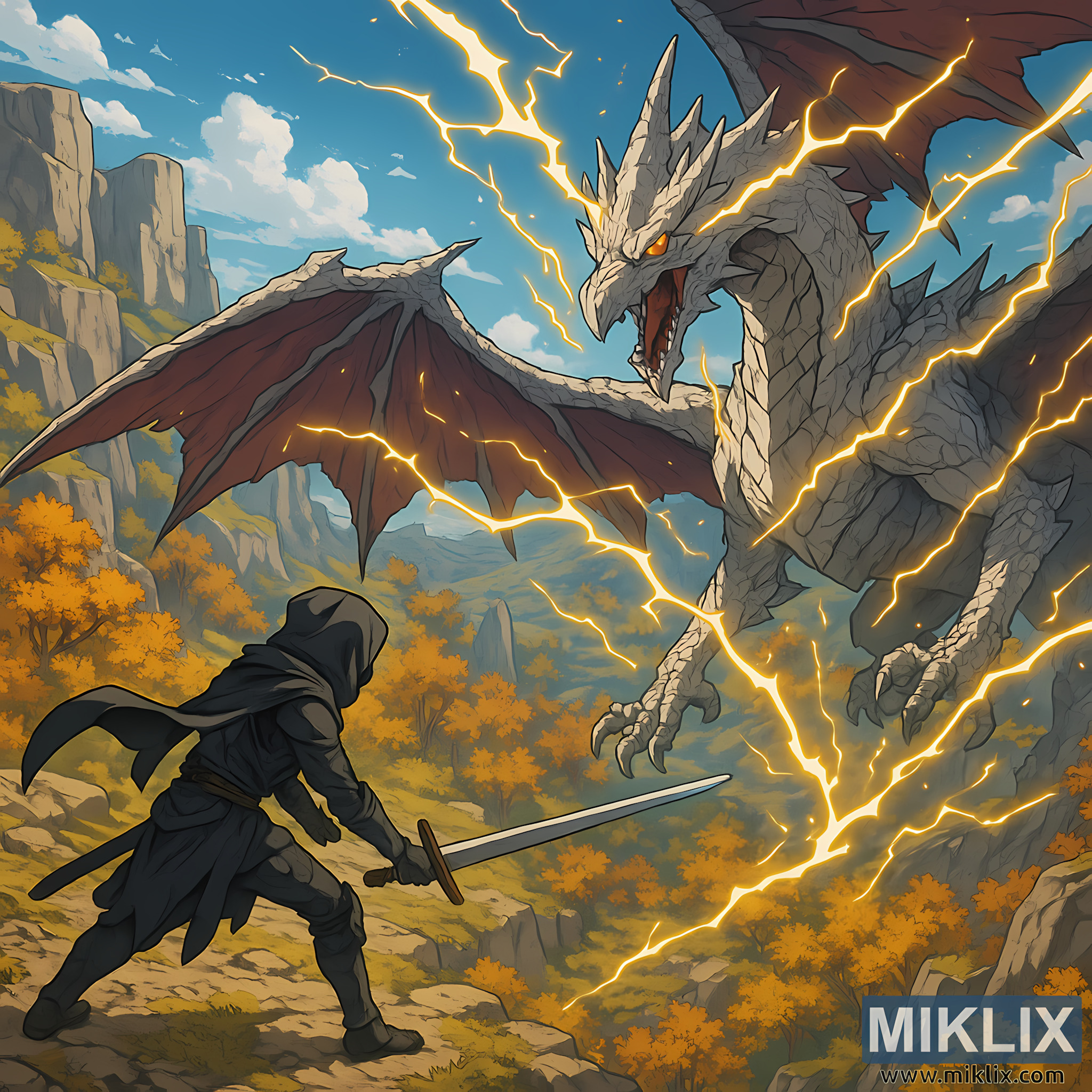 The sky above is a vast expanse of cerulean blue, with soft clouds drifting behind the chaos of lightning arcs. These lightning bursts form energetic diagonals that help guide the viewer’s eye across the composition, connecting the Tarnished’s grounded stance with the dragon’s explosive presence. The isometric angle enhances the sense of strategy and scale—invoking the feeling of surveying a monumental clash from a vantage where the environment itself becomes a character.