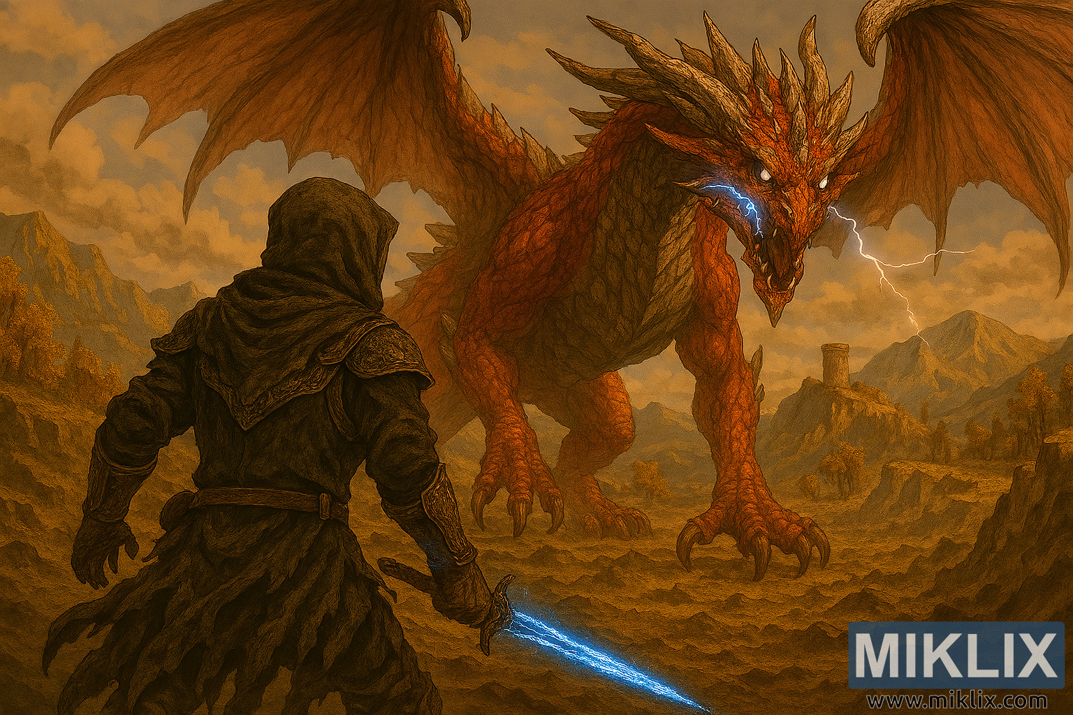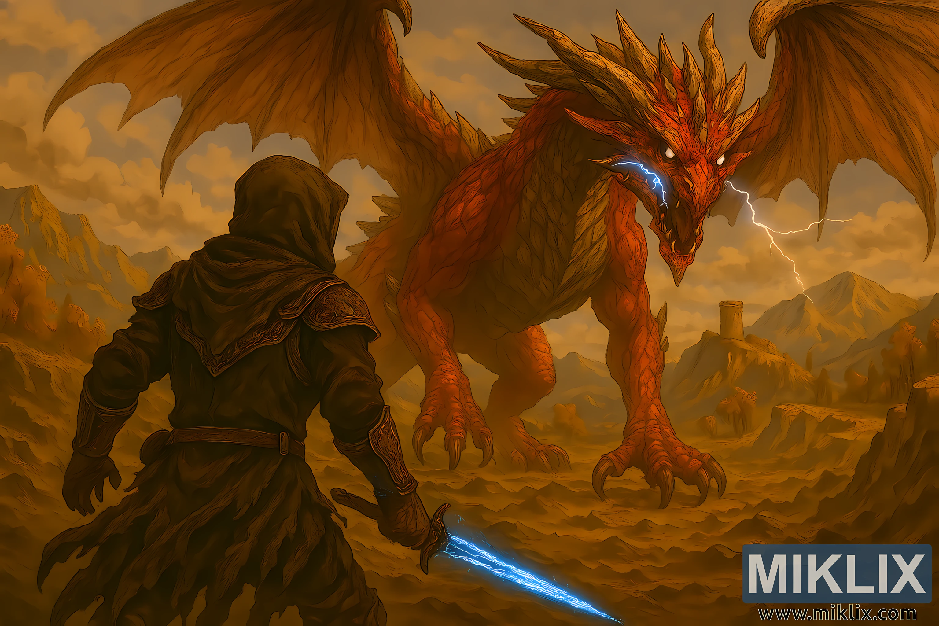 The composition is diagonal and cinematic, with the Tarnished and Lansseax positioned opposite each other across the frame. The glowing sword and lightning serve as visual anchors, contrasting against the warm earth tones of the landscape and the dragon’s crimson scales. Depth is achieved through detailed foreground textures and a slightly softened background, enhancing realism and scale.