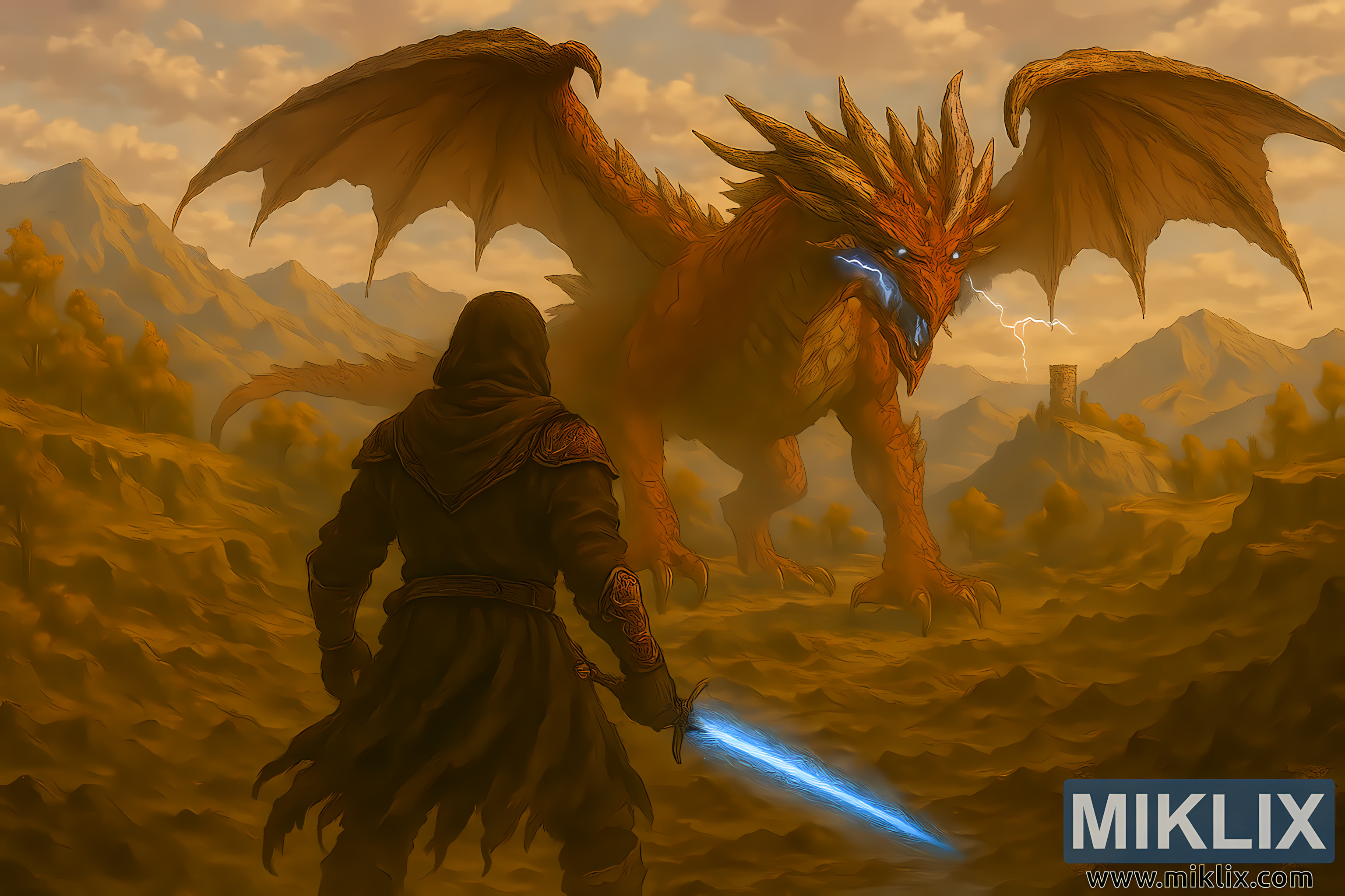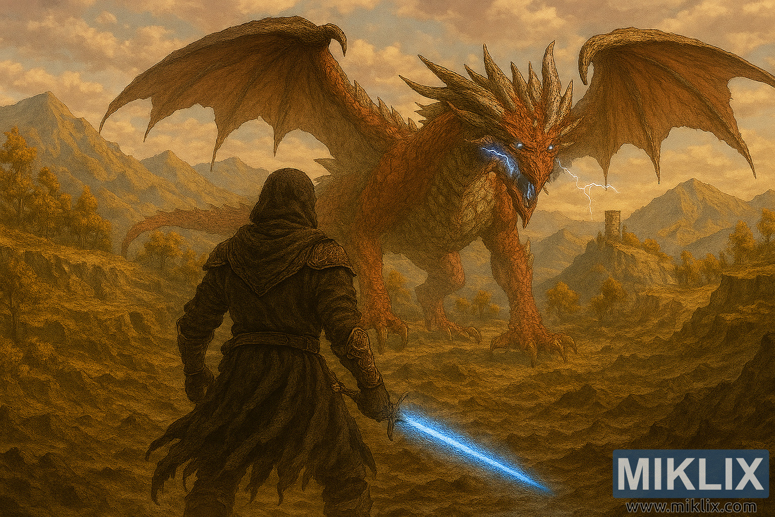 The composition emphasizes scale and atmosphere. The elevated angle allows for a sweeping view of the terrain, with the Tarnished and Lansseax positioned diagonally across the frame. The glowing sword and lightning serve as visual anchors, contrasting against the warm earth tones of the landscape and the dragon’s crimson scales. Depth is achieved through detailed foreground textures and softened background elements, enhancing realism and immersion.