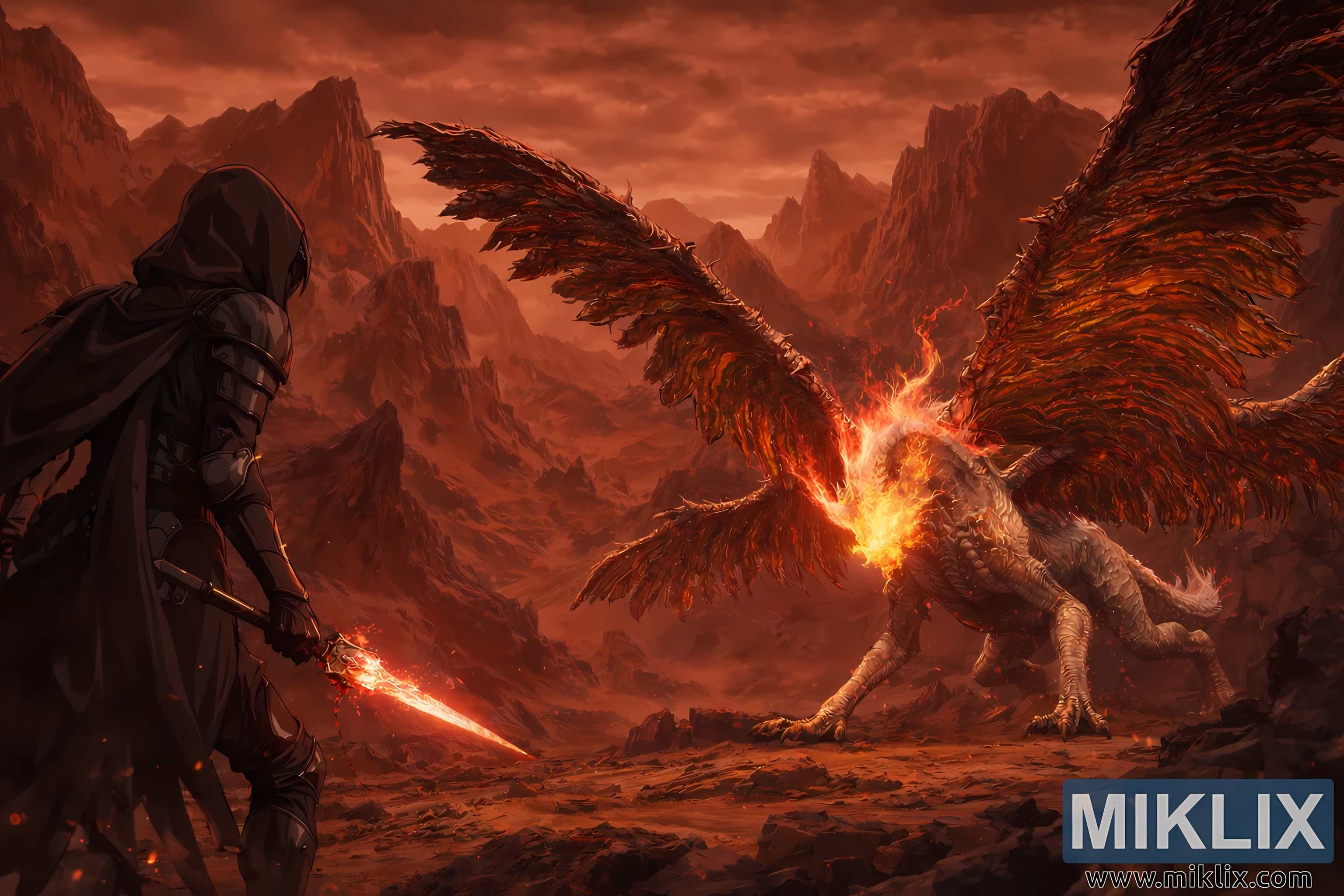 The space between the two figures is charged with anticipation. Neither has attacked yet, but the composition captures the exact moment before violence erupts. Sparks and ash drift through the air, subtly bridging the gap between warrior and dragon. The lighting emphasizes contrast: warm highlights from the dragon’s internal fire and the environment’s red glow clash against the Tarnished’s dark armor, visually reinforcing the impending clash of mortal resolve against ancient, elemental power. Overall, the image conveys suspense, scale, and danger, freezing a breathless instant before combat begins.