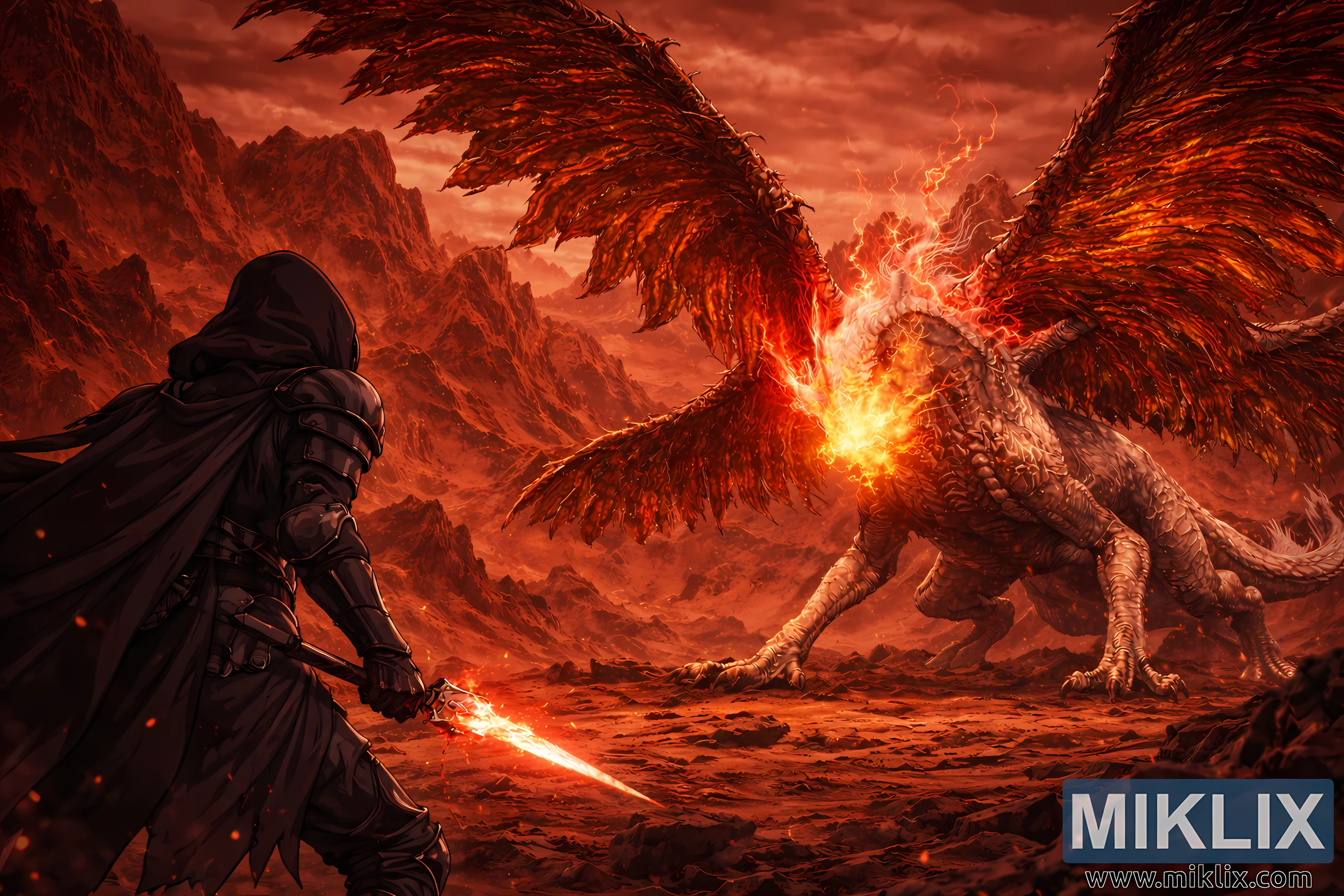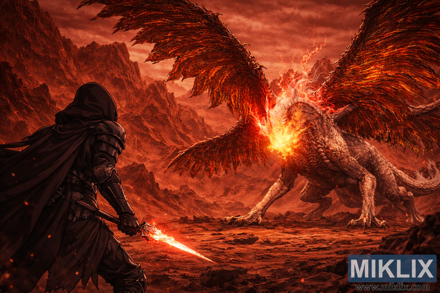 The Tarnished is positioned on the left side of the frame, seen partially from behind, which places the viewer directly in the warrior’s perspective. Clad in Black Knife armor, the Tarnished appears small and vulnerable compared to the immense foe ahead. The armor is dark and matte, absorbing much of the fiery ambient light, with sharp, elegant lines that suggest speed, stealth, and lethality rather than brute strength. A hooded cloak drapes over the Tarnished’s shoulders and back, its fabric catching faint highlights along the folds as it trails behind the figure. The Tarnished’s stance is tense and deliberate: feet planted firmly on cracked, scorched ground, shoulders squared toward the enemy, and head tilted slightly upward to meet the dragon’s gaze.