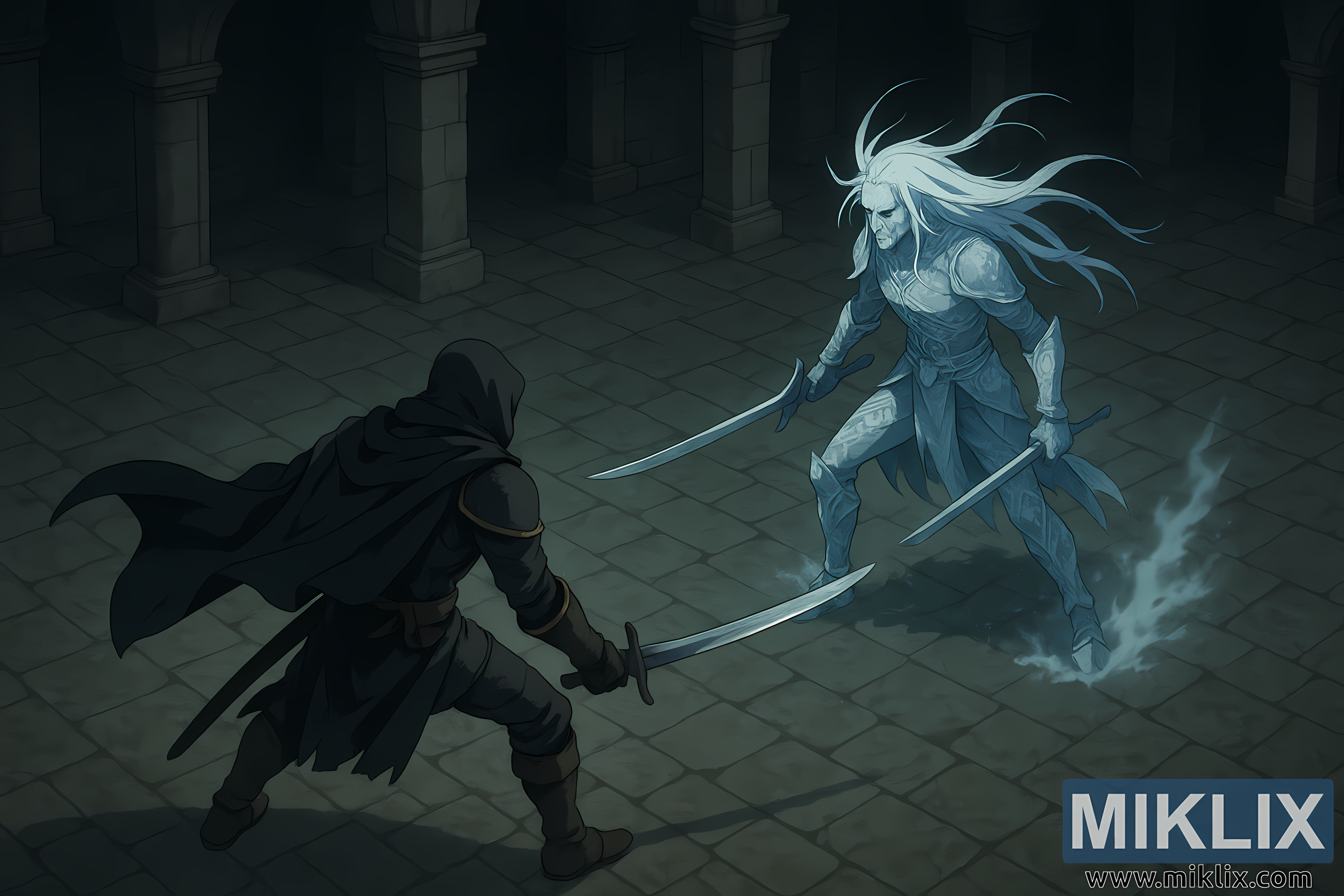 Opposite him, the Ancient Hero of Zamor stands tall and ghostly. His figure radiates a cold, bluish luminescence that spills across the stone floor like reflected moonlight. The isometric view reveals the long, slender form of his frost-forged armor—textured with crystalline ridges and layered plates that mimic the look of carved ice. His long white hair fans outward in dynamic arcs, emphasizing his supernatural presence. In each hand he carries a curved sword, both distinctly rendered and fully separated, their designs elegant yet lethal. The blade in his right hand is raised slightly forward, poised for a swift strike, while the blade in his left hand is lowered defensively, mirroring a calculated, practiced combat stance.