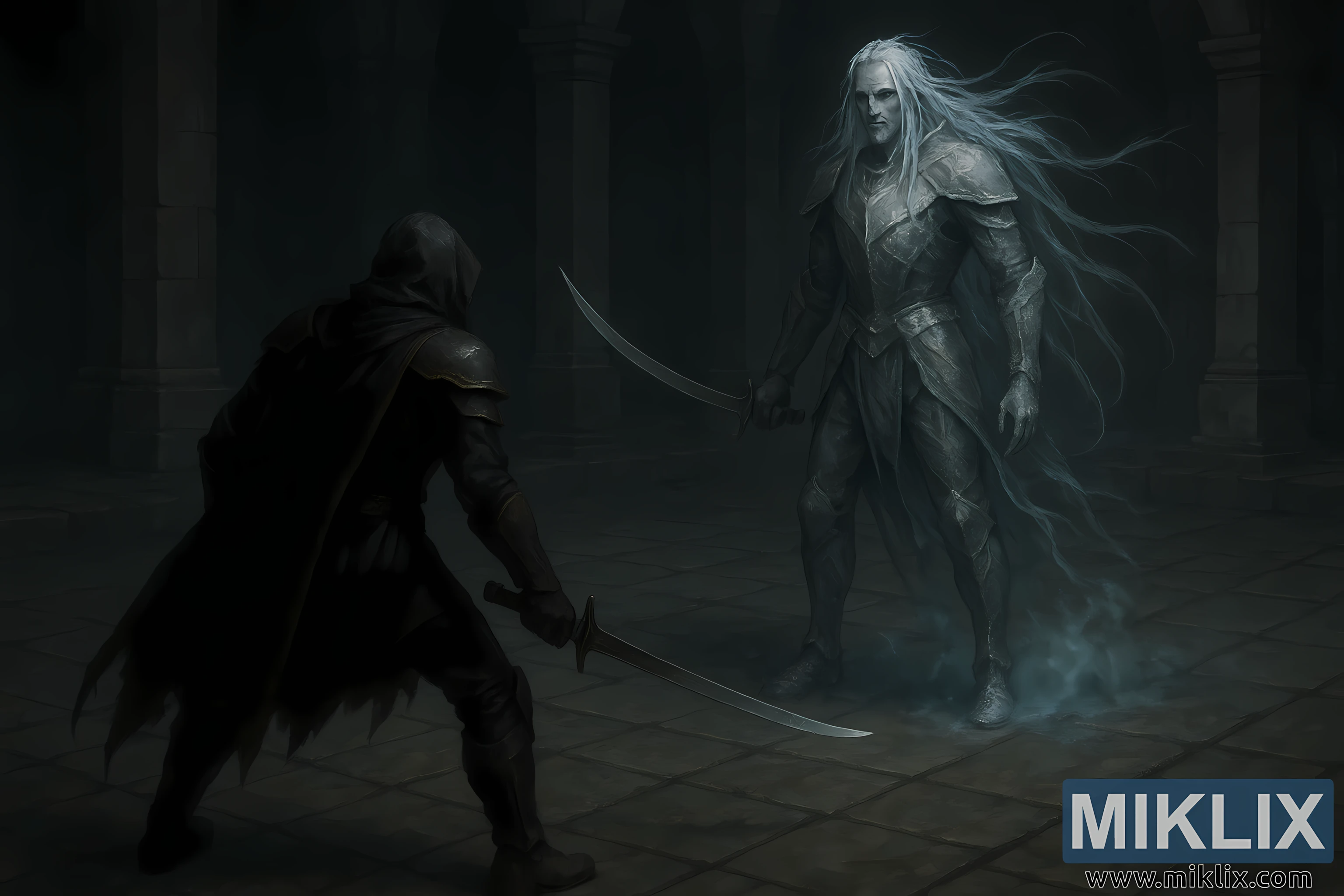 The environment around them reinforces the gravity of the duel. Massive pillars fade into darkness, their surfaces chipped and scarred by centuries. The tiled floor beneath the combatants is uneven, marred by cracks and shallow depressions. Subtle light filters from above and to the sides, creating sweeping gradients of shadow that render the space vast and cold. Wisps of icy vapor coil around the Zamor warrior’s legs, spreading across the ground like creeping frost that refuses to melt.
