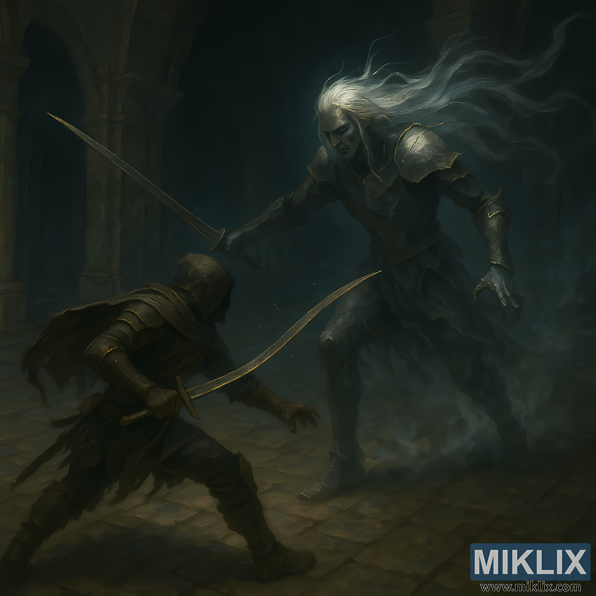 In his right hand he wields a single curved sword—the blade now cleanly depicted without the earlier unintended lower extension. The weapon’s arc is elegant and deadly, rendered with a glint of silvery frost. He swings downward with formidable strength, his posture wide and imposing, one arm extended behind him for balance. The contact point between the two swords is the visual and dramatic centerpiece of the image: steel meets spectral ice with a burst of motion and a spray of faint glowing particles, suggesting both physical impact and magical resonance.
