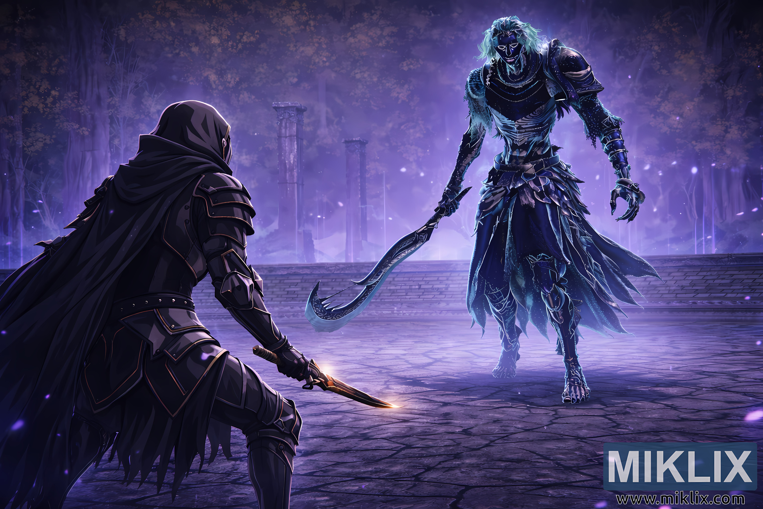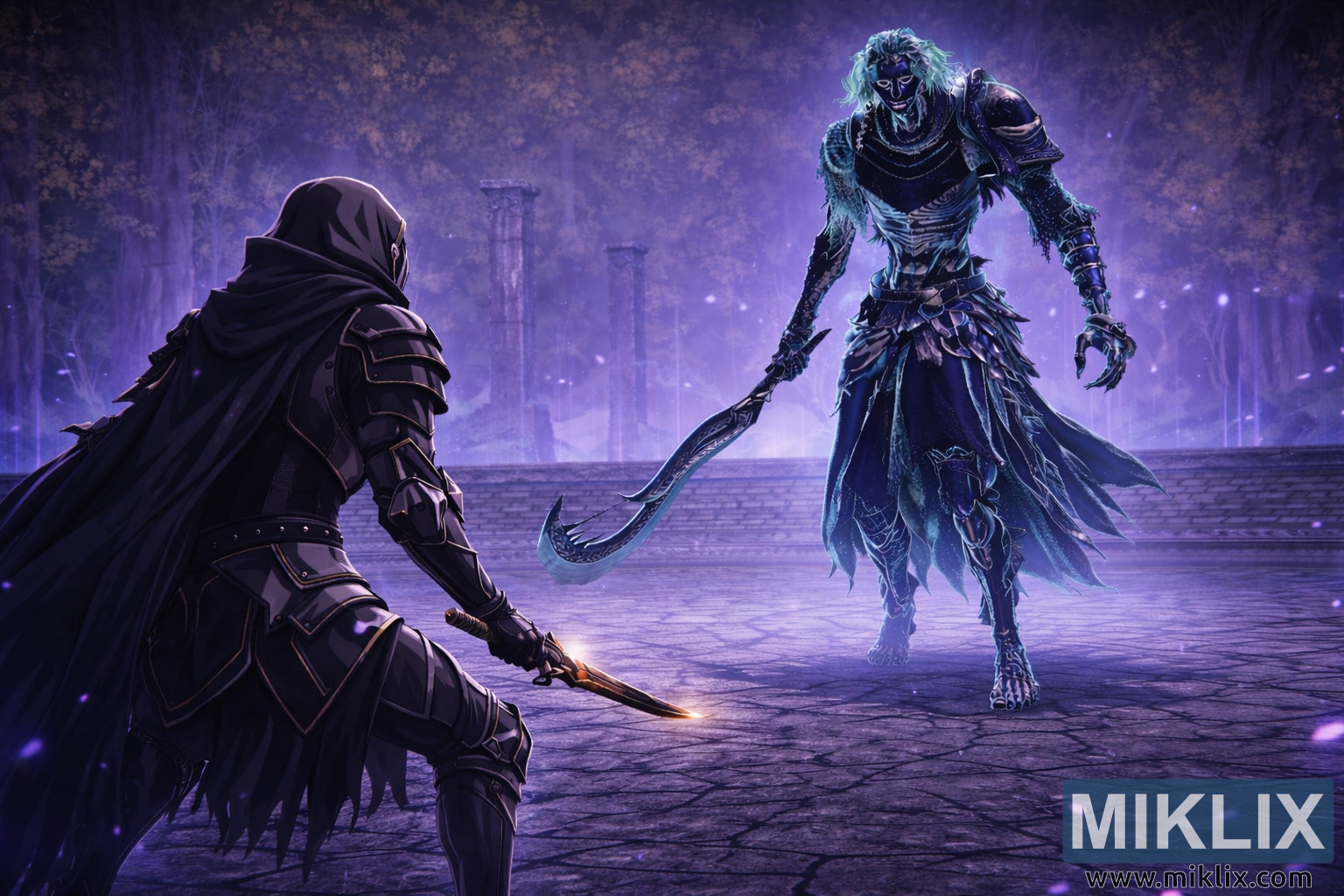 The battleground beneath them consists of cracked circular stone tiles etched with faint runic patterns that emit a soft lavender glow. Between the two combatants stretches a wide empty space filled with drifting purple motes and shimmering dust, symbolizing the silent tension that precedes violence. Surrounding the arena are translucent vertical pillars forming a magical barrier, beyond which a dim forest recedes into bluish haze and soft fog. Tree silhouettes and distant trunks remain blurred, adding depth without distracting from the central figures. Overhead, the sky transitions through gradients of indigo, violet, and muted blue, bathing the entire environment in cool atmospheric lighting. Long shadows stretch across the stone floor, accentuating armor edges, weapon contours, and flowing fabrics. The overall color scheme is dominated by purples, blues, and teals, punctuated only by the dagger’s warm highlight, which serves as a focal contrast.