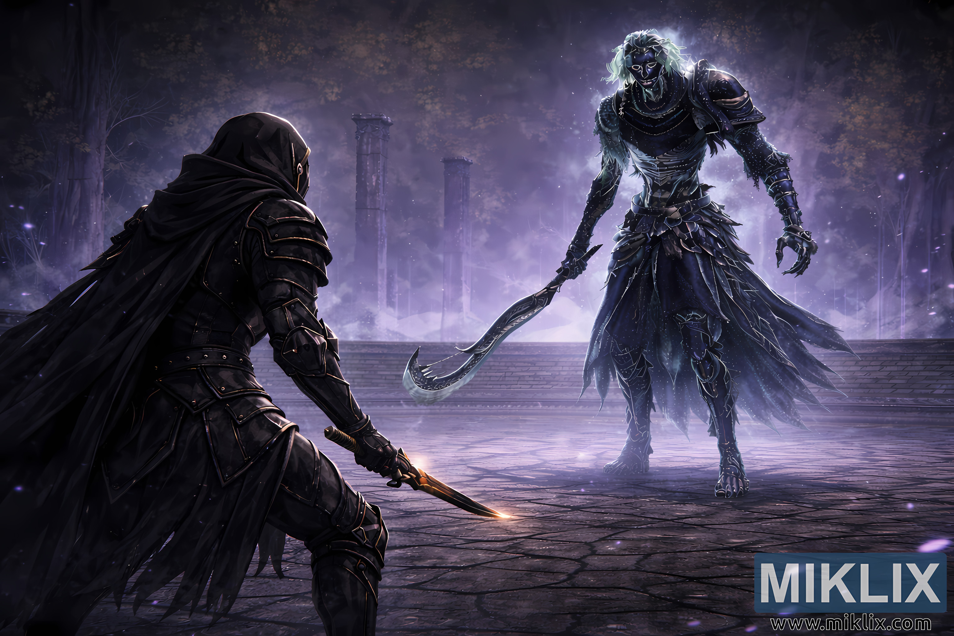 The arena floor consists of cracked stone tiles etched with faint runic patterns that glow subtly beneath a haze of purple light. Wisps of fog and drifting particles fill the open space between the two figures, symbolizing suspended tension and the fragile calm before violence. Surrounding the arena are tall translucent pillars forming a magical barrier, beyond which a dim forest fades into bluish haze and soft atmospheric blur. The background trees are indistinct silhouettes, providing depth without distracting from the central confrontation. Overhead, the sky transitions through gradients of indigo, slate blue, and muted violet, bathing the scene in cold ambient illumination. Directional lighting casts elongated shadows across the ground while accentuating the contours of armor, fabric, and weapon edges.