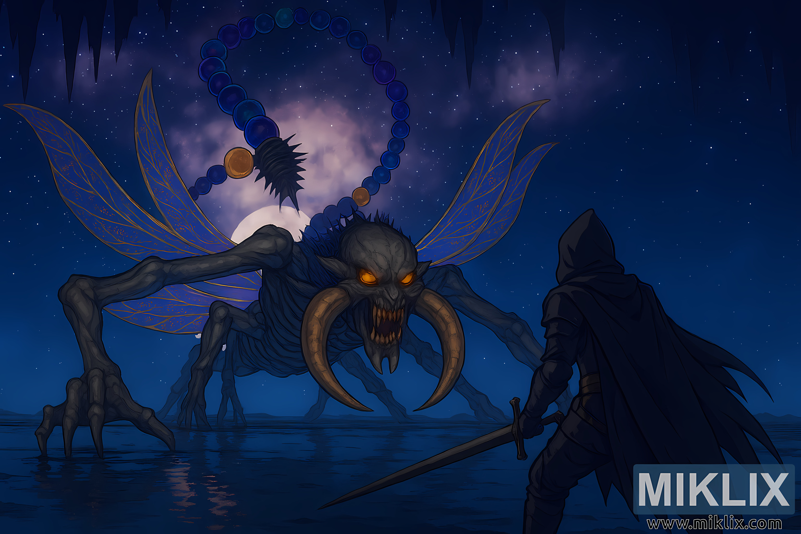 Astel dominates the left side of the composition—a towering, insectoid cosmic horror with a skeletal exoskeleton and elongated limbs ending in claw-like appendages. Its wings are translucent and iridescent, patterned like a dragonfly’s, shimmering with blues, purples, and golds. The creature’s skull-like head features glowing orange eyes and massive horn-like mandibles protruding from its mouth, curving outward and downward in a menacing arc. Notably, Astel has no horns atop its head, preserving anatomical accuracy. Its segmented tail arches high above its body, adorned with glowing orbs in shades of violet and blue, connected by spiked, bony segments that culminate in a stinger-like tip.