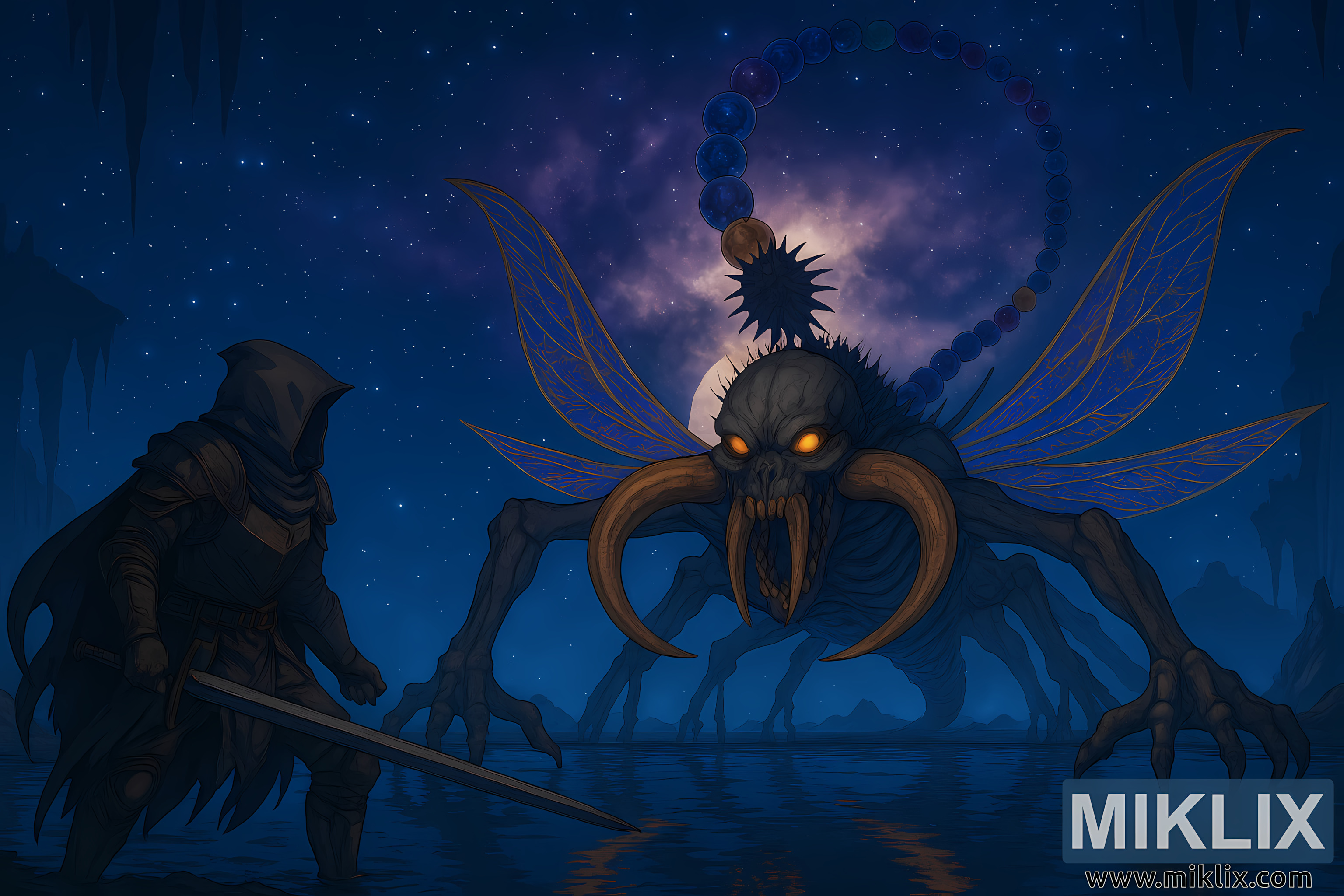 Astel dominates the right side of the composition—a towering, insectoid cosmic horror with a skeletal exoskeleton and elongated limbs ending in claw-like appendages. Its wings are translucent and iridescent, patterned like a dragonfly’s, shimmering with blues, purples, and golds. The creature’s skull-like head features glowing orange eyes and massive horn-like mandibles protruding from its mouth, curving outward and downward in a menacing arc. Notably, Astel has no horns atop its head, preserving anatomical accuracy. Its segmented tail arches high above its body, adorned with glowing orbs in shades of violet and blue, connected by spiked, bony segments that culminate in a stinger-like tip.