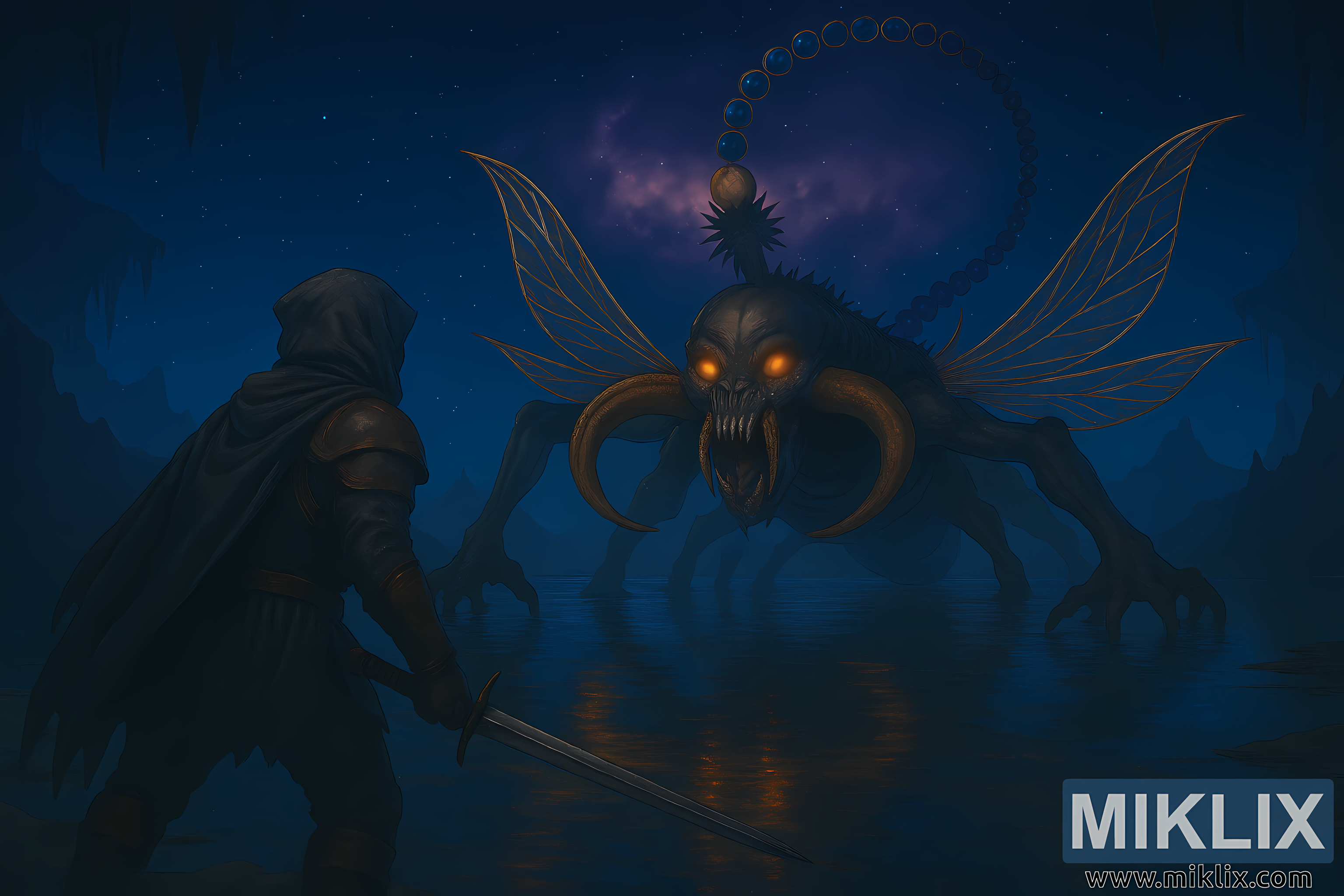 Astel dominates the right side of the composition—a towering, insectoid cosmic horror with a skeletal exoskeleton and elongated limbs ending in claw-like appendages. Its wings are translucent and iridescent, patterned like a dragonfly’s, shimmering with blues, purples, and golds. The creature’s skull-like head features glowing orange eyes and massive horn-like mandibles protruding from its mouth, curving outward and downward in a menacing arc. Notably, Astel has no horns atop its head, preserving anatomical accuracy. Its segmented tail arches high above its body, adorned with glowing orbs in shades of violet and blue, connected by spiked, bony segments that culminate in a stinger-like tip.