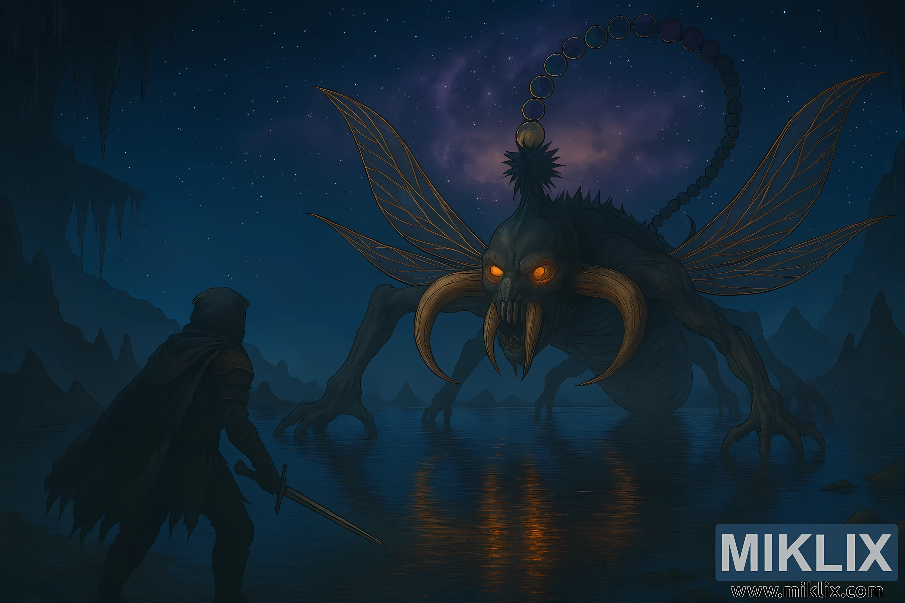 Astel dominates the right side of the composition, now scaled to immense proportions. This towering cosmic horror looms over the Tarnished with overwhelming presence. Its skeletal exoskeleton is segmented and ridged, with elongated limbs ending in claw-like appendages that pierce the water’s surface. Its wings are translucent and iridescent, patterned like a dragonfly’s, shimmering with blues, purples, and golds. The creature’s skull-like head features glowing orange eyes and massive horn-like mandibles protruding from its mouth, curving outward and downward in a menacing arc. Notably, Astel has no horns atop its head, preserving anatomical accuracy.
