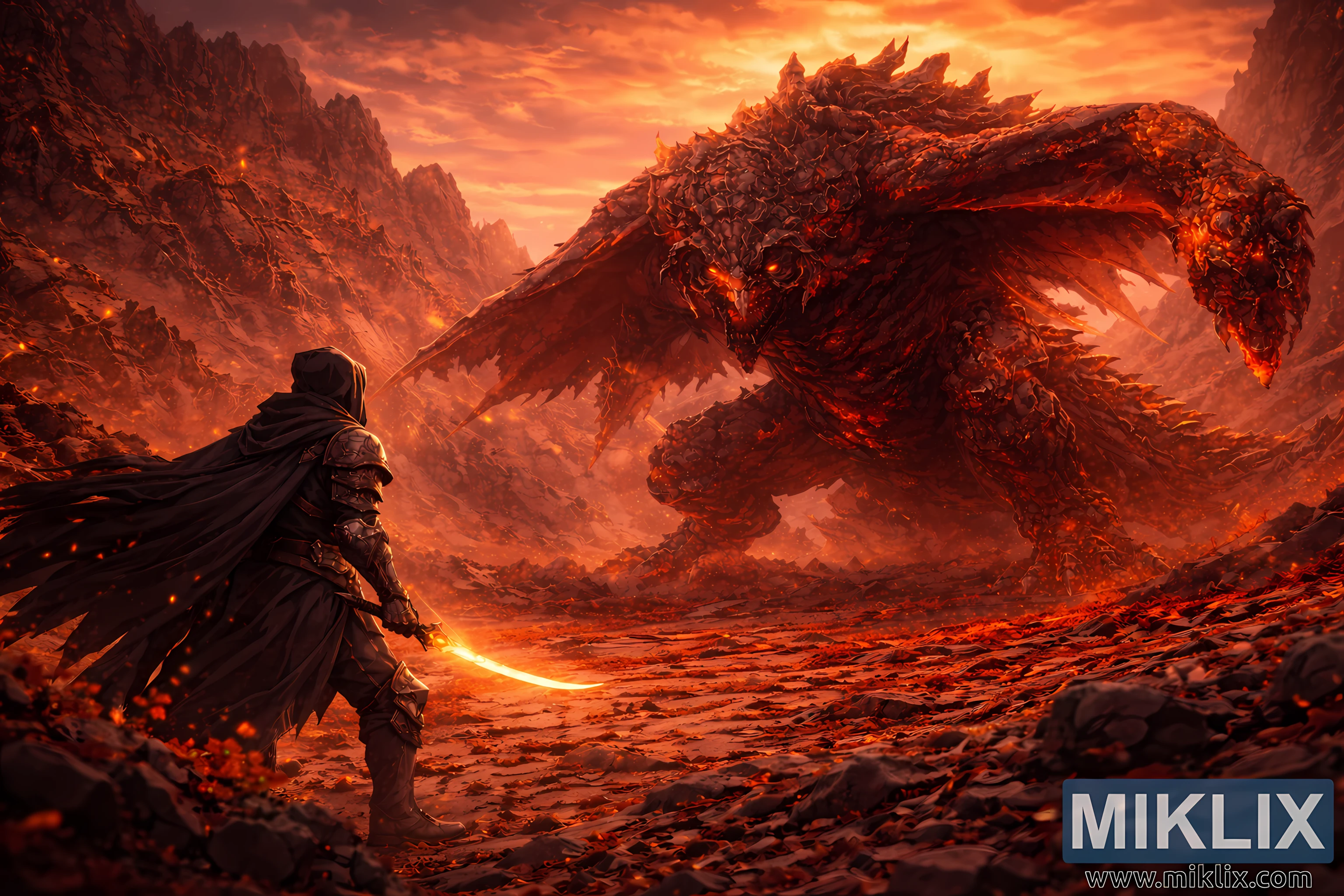 Lighting is warm and infernal, casting long shadows and enhancing contrast between the Tarnished’s dark armor and Bayle’s fiery, molten presence. The overall mood is tense and awe-filled, capturing the instant where both combatants measure one another in silence: the Tarnished poised with cautious resolve, and Bayle towering like an ancient calamity about to descend.