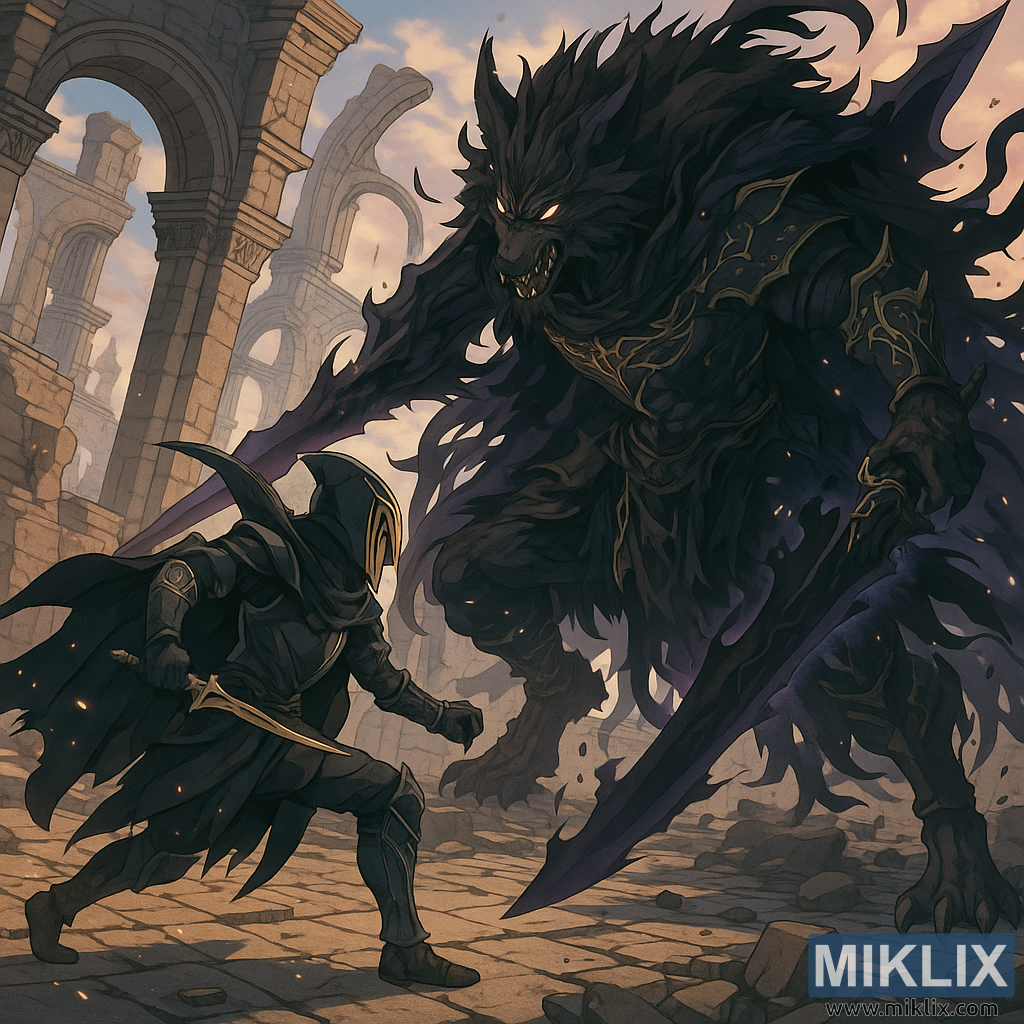 Between the combatants, broken stones scatter in every direction, the aftermath of the beast’s movements or perhaps the tremors resulting from the clash of their weapons. The architecture around them—collapsed archways, crumbling towers, and intricate runic carvings half lost to erosion—conveys both grandeur and despair, a once-sacred place now suspended between ruin and eternity. The sky, painted in soft golds and muted blues, contrasts the violence unfolding below, its serenity a sharp counterpoint to the intensity of the moment.