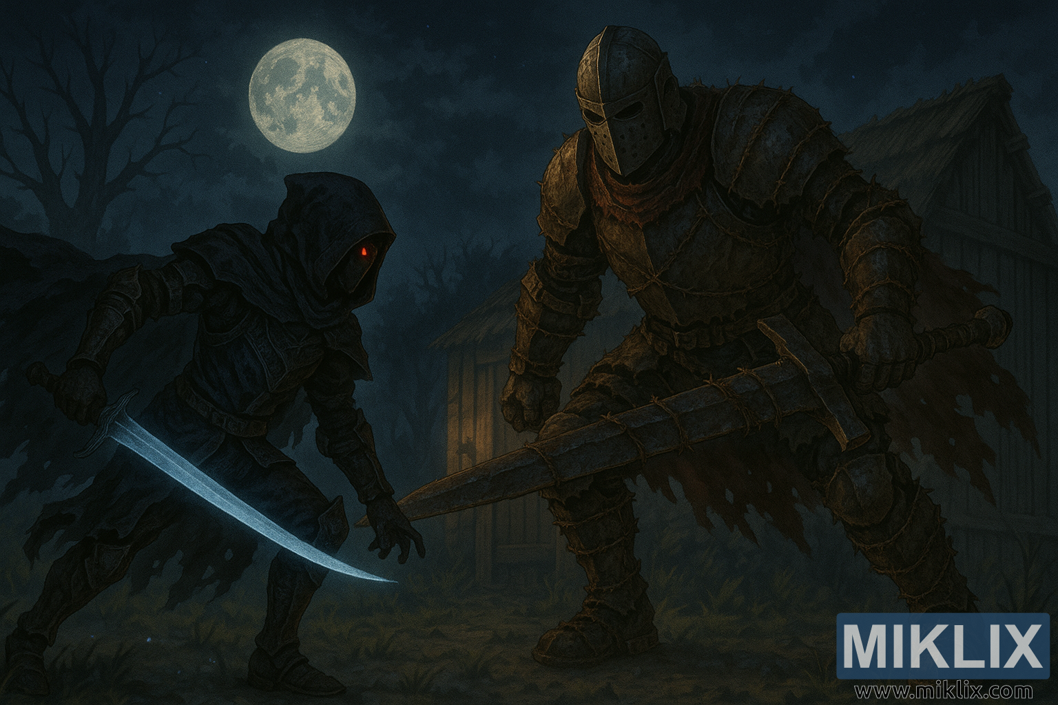Image: Tarnished vs. Bell-Bearing Hunter — Night Battle at the Shack