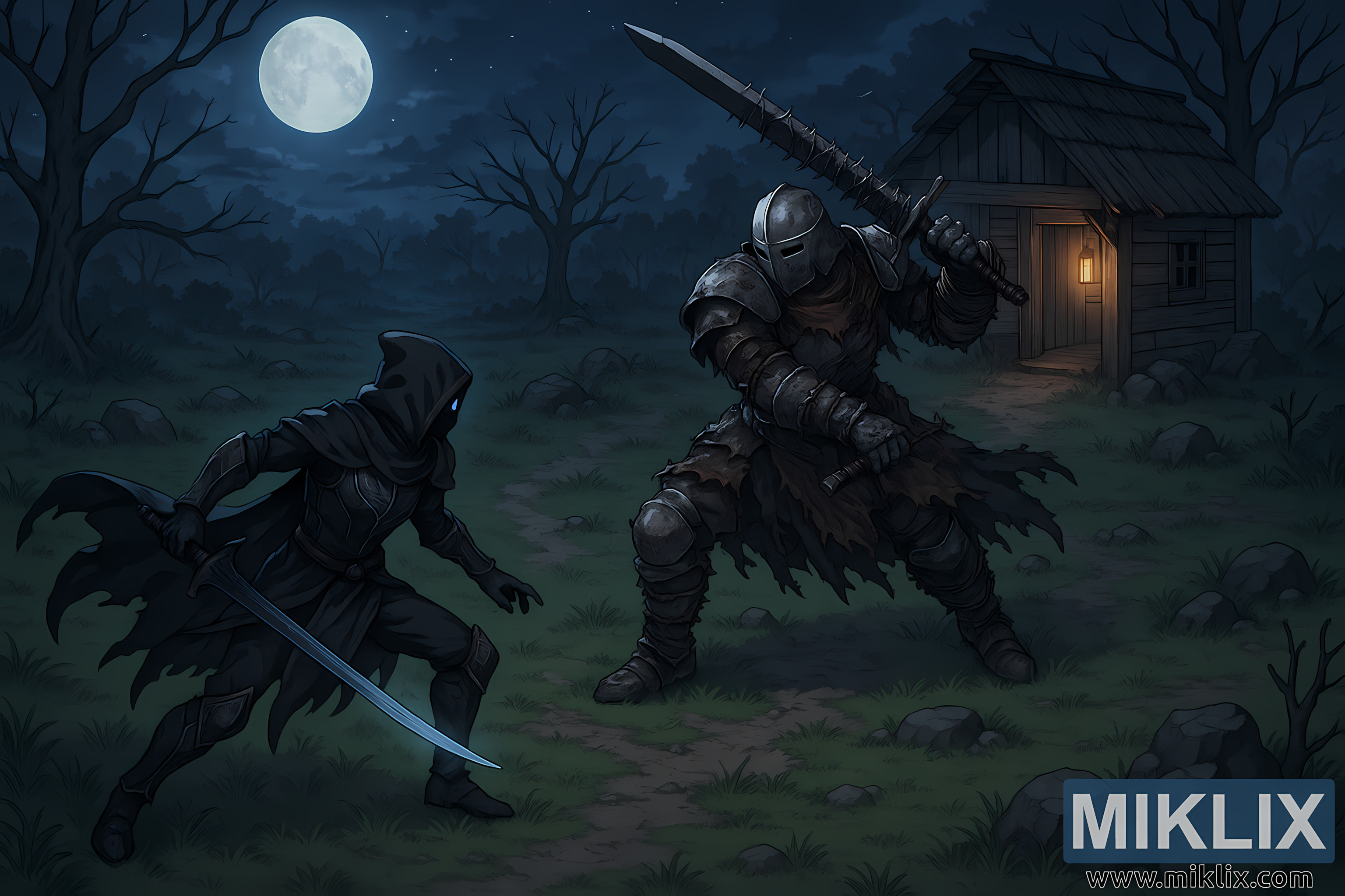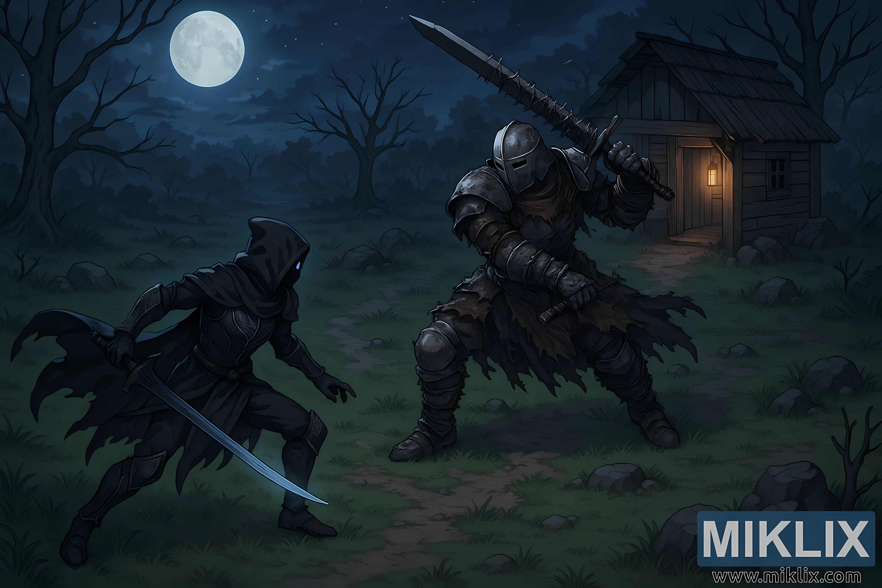 The scene now unfolds from a widened, elevated perspective—pulled back and tilted upward into a soft isometric angle that reveals not only the fighters but the battlefield that surrounds them. Moonlight cascades over the landscape, turning the clearing into a pool of bluish shadow while the lantern at the shack’s entrance provides a warm, flickering contrast. The Isolated Merchant’s Shack stands on the far right, its slanted thatched roof dark against the sky, the structure worn but upright, wood aged to a gray-brown that speaks of years of wind and rain. Rocks and patches of uneven grass scatter across the clearing, and the path between the shack and the combatants winds like a thin strip of lighter earth, drawing the viewer into the tension of the moment.