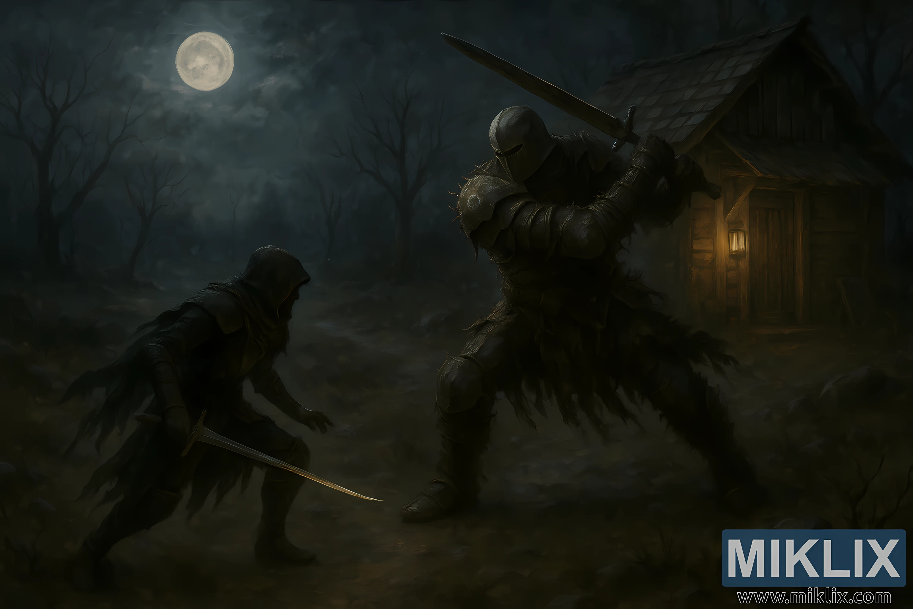 Behind him sits the shack—small, leaning, its boards warped by years of storms. A single lantern glows at the doorway, casting amber light into the darkness like a fragile heartbeat refusing to die. The glow does not illuminate the battle; it merely observes it, flickering faintly against the rough wooden walls and the tangled grass around the threshold. Everything beyond this circle of light fades into fog and forest, where dead trees reach upward like skeletal silhouettes against the moonlit sky.