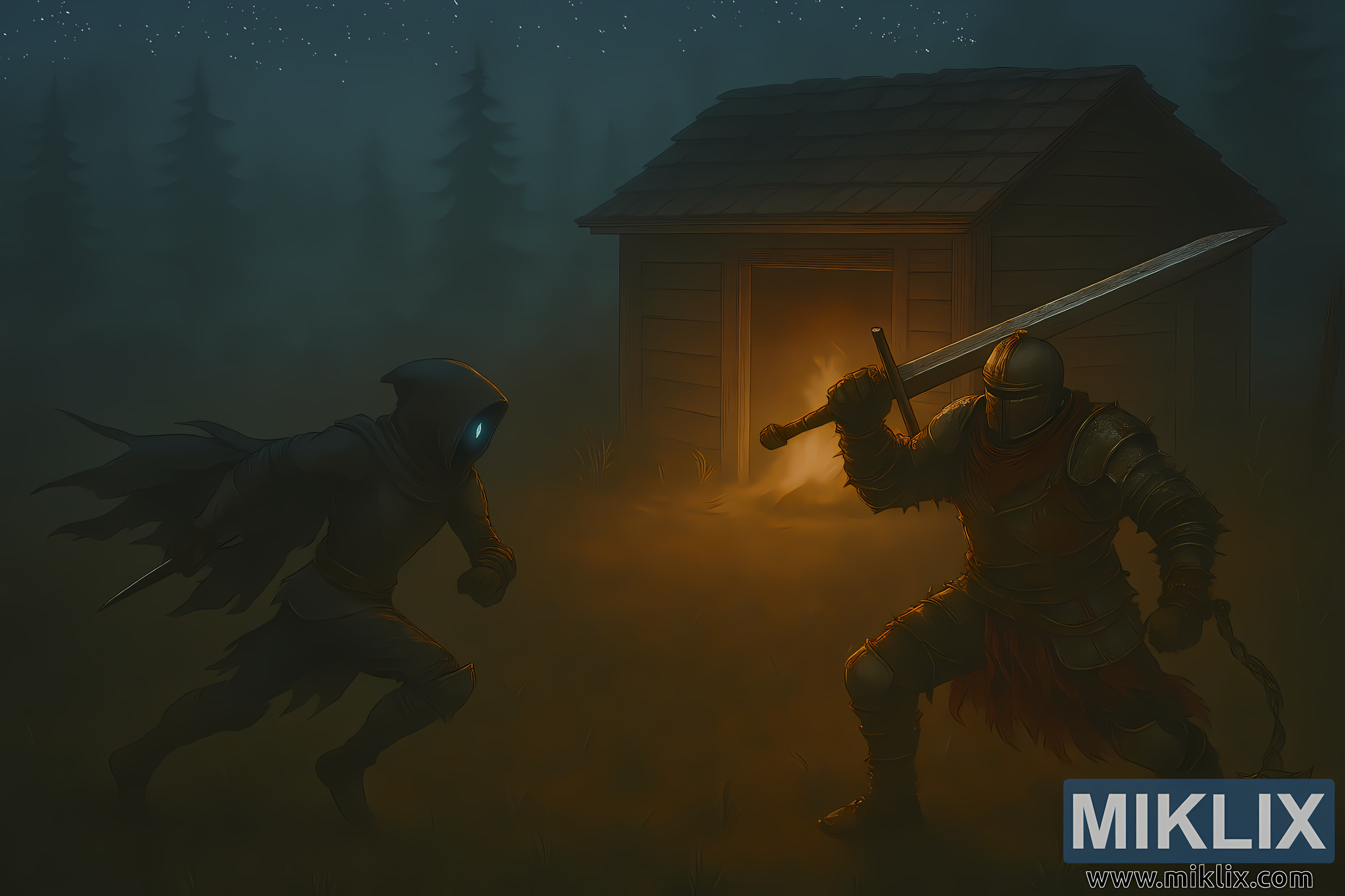 The shack behind them is built from weathered logs with a slanted, shingled roof. Its open doorway glows with the light of a fire inside, casting flickering shadows across the grass and the warriors. Notably, the shack bears no sign above the entrance, adding to the anonymity and desolation of the setting. The surrounding grass is tall and wild, disturbed by the combatants’ movements.