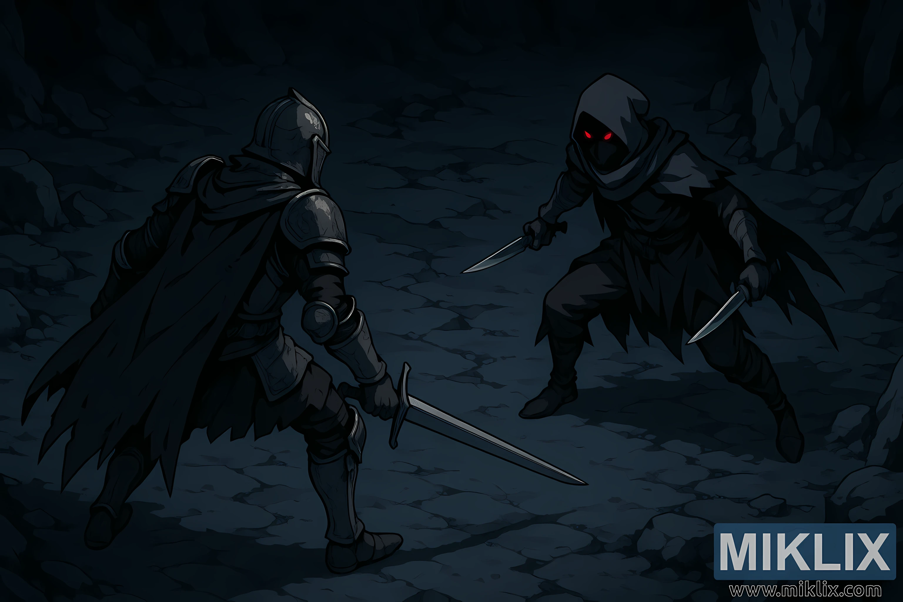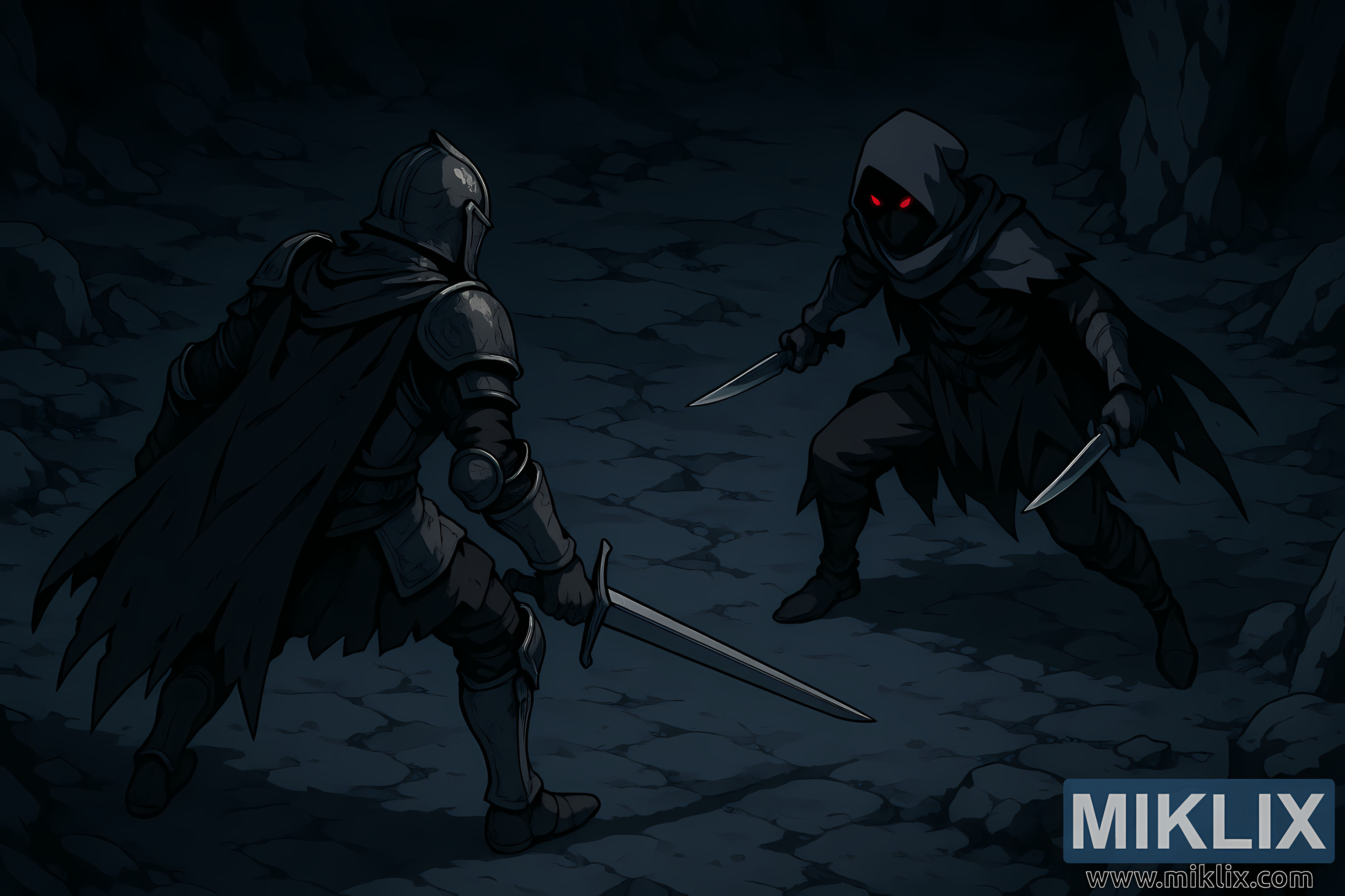 Opposite the Tarnished, positioned to the right, is the Black Knife Assassin. The Assassin’s hooded silhouette blends into the darkness, with layered, shadowy garments that obscure most bodily detail. The most striking feature is the pair of glowing red eyes beneath the hood, sharply contrasting against the subdued color palette and immediately drawing the viewer’s focus. The Assassin crouches in a predatory stance, knees bent and torso angled forward, wielding a dagger in each hand. Both blades are clearly grounded in the Assassin’s grip, angled outward and ready for swift, lethal strikes.