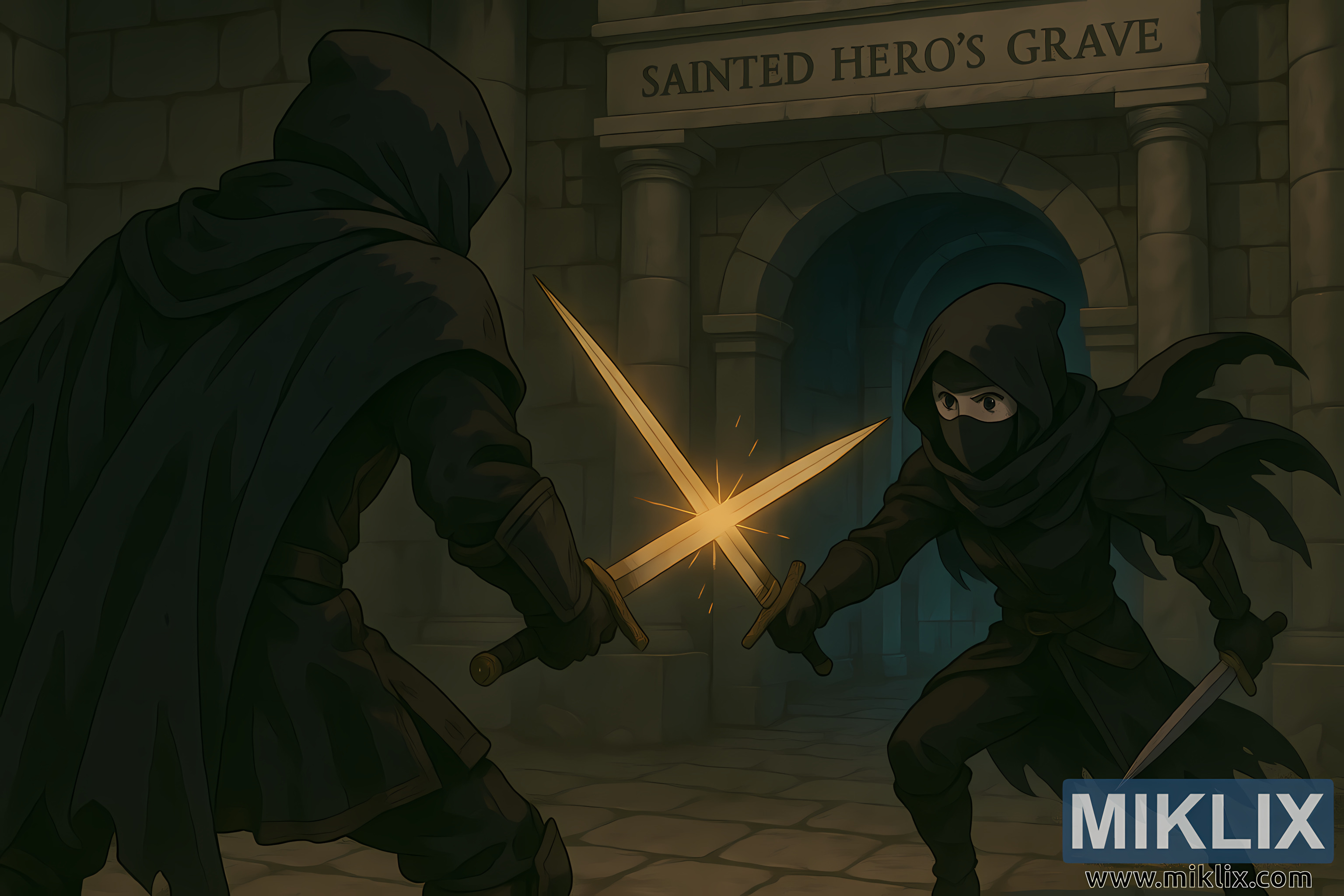An anime-style depiction of the Tarnished battling the Black Knife Assassin at the Sainted Hero’s Grave entrance, featuring dramatic lighting and dynamic combat.