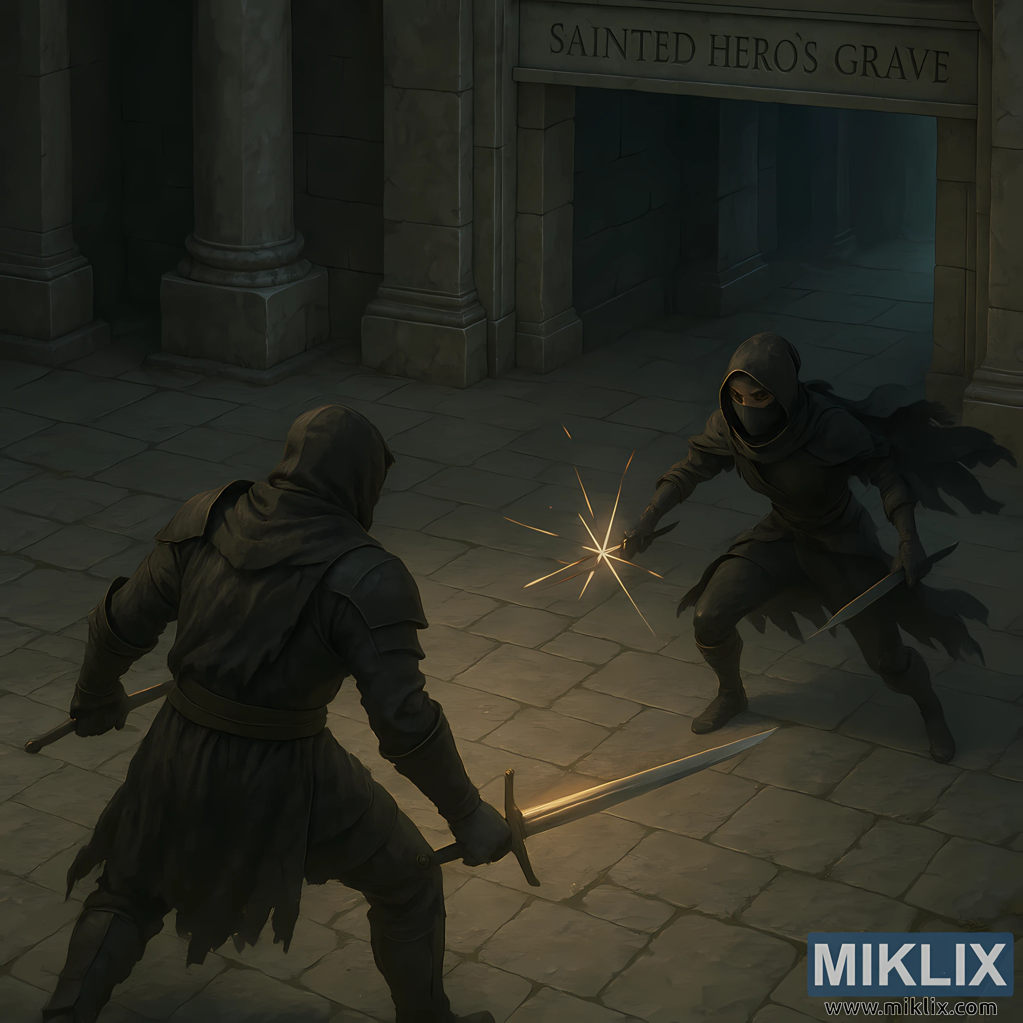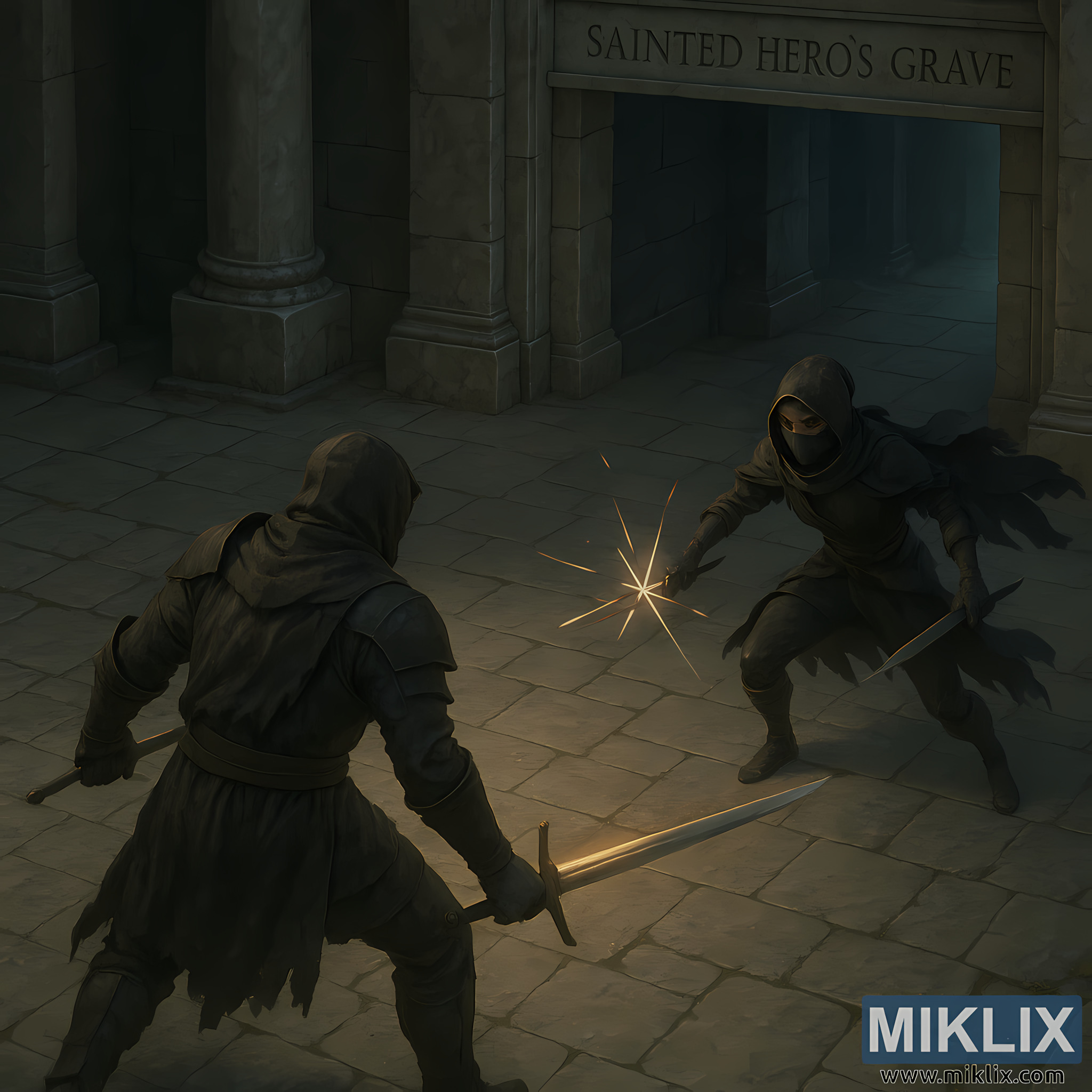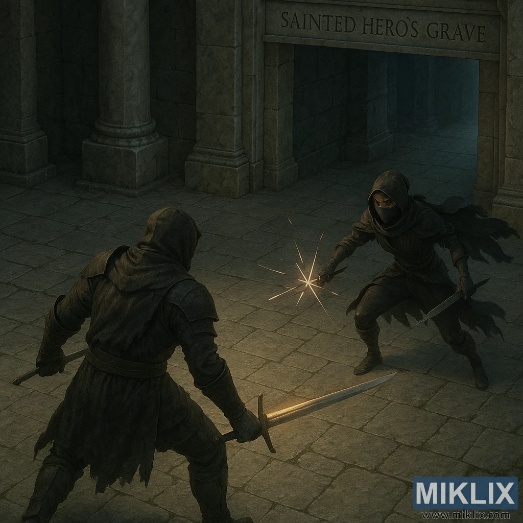 Opposite him, the Black Knife Assassin crouches low near the entrance to the grave. The assassin’s clothing consists of layered dark fabrics and light armor plates, all rendered with realistic fabric texture and shadow depth. A mask covers the lower half of the assassin’s face, leaving only sharp, alert eyes visible. The assassin wields two daggers—one held out defensively near the clash point, the other drawn back to prepare a follow-up strike. A brief burst of sparks marks the moment steel meets steel, the only bright interruption in the otherwise cool, desaturated color palette.