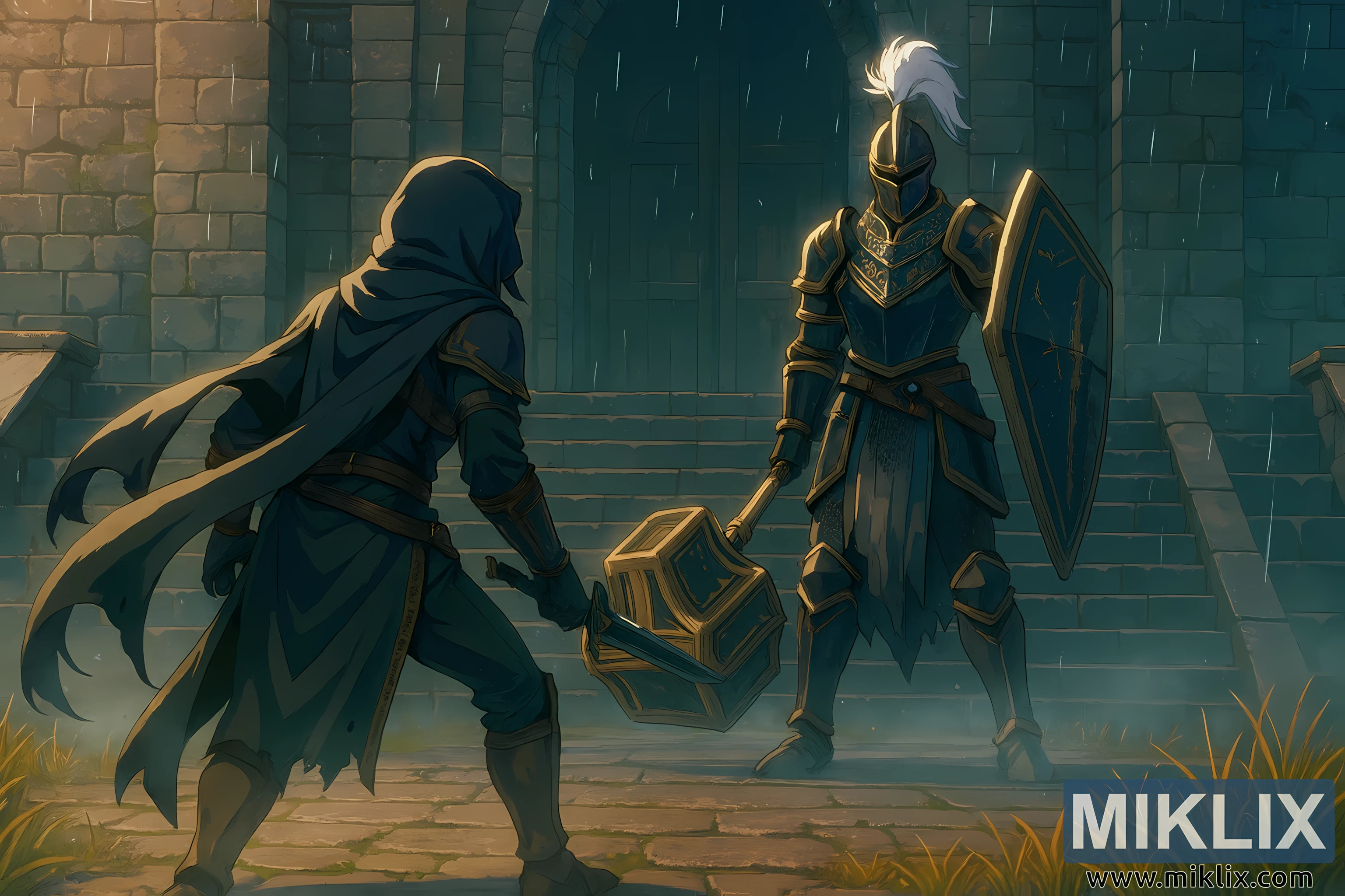 Opposite them, on the right side of the image, looms Black Knight Garrew—a towering figure encased in ornate, heavy armor. His great helm features a plume of white feathers, and his armor gleams with dark steel and gold accents. The engravings on his breastplate, pauldrons, and greaves suggest a knight of ancient lineage and brutal power. In his left hand, he grips a massive rectangular shield adorned with gold trim and intricate carvings. His right hand wields a colossal golden warhammer, its head hollowed and paneled with raised edges and runic etchings. Garrew’s stance is wide and grounded, radiating menace and strength.