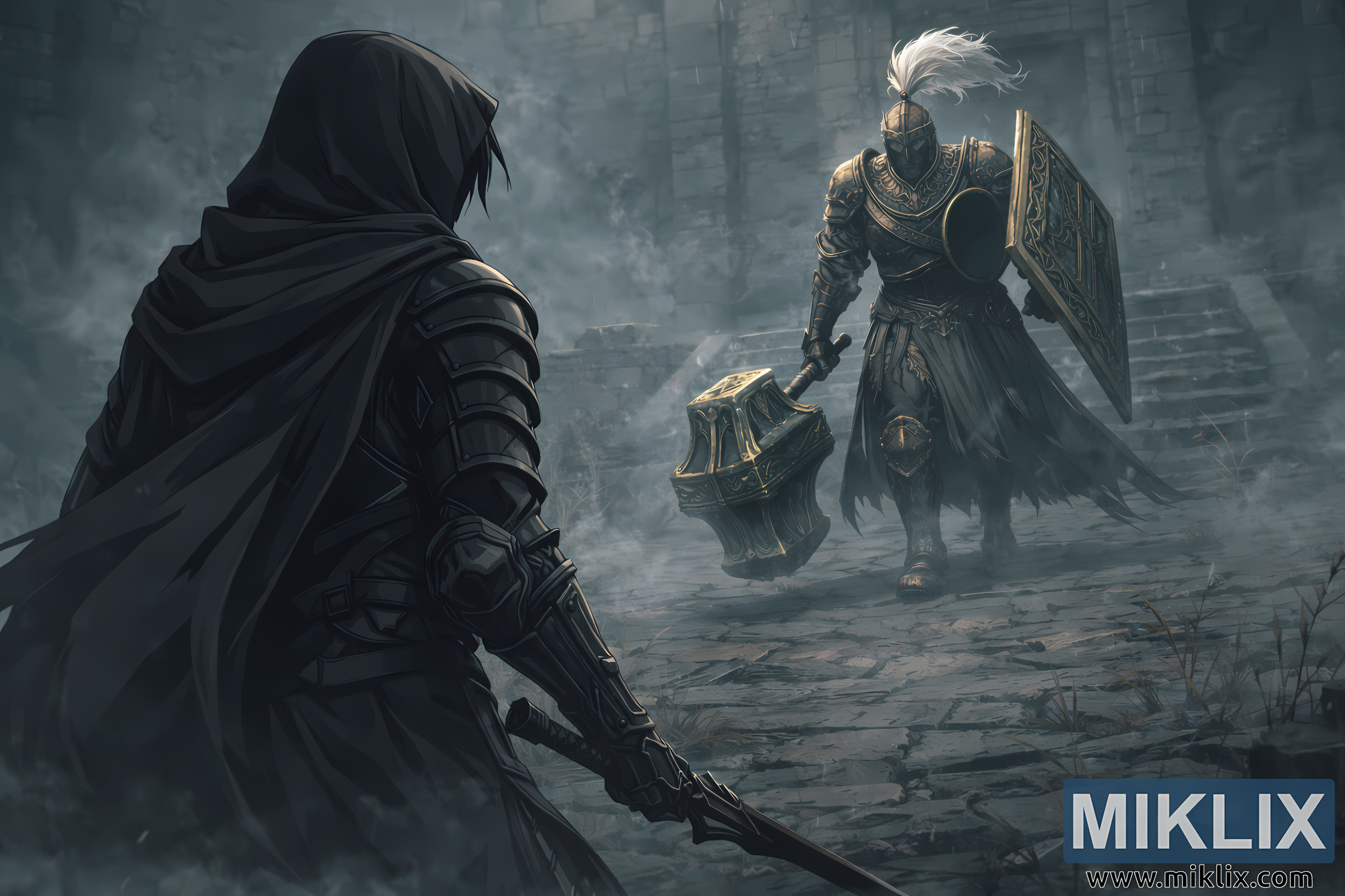 Anime style fan art from Elden Ring: Shadow of the Erdtree showing the Tarnished seen from behind confronting Black Knight Garrew in the fog filled ruins of Fog Rift Fort.