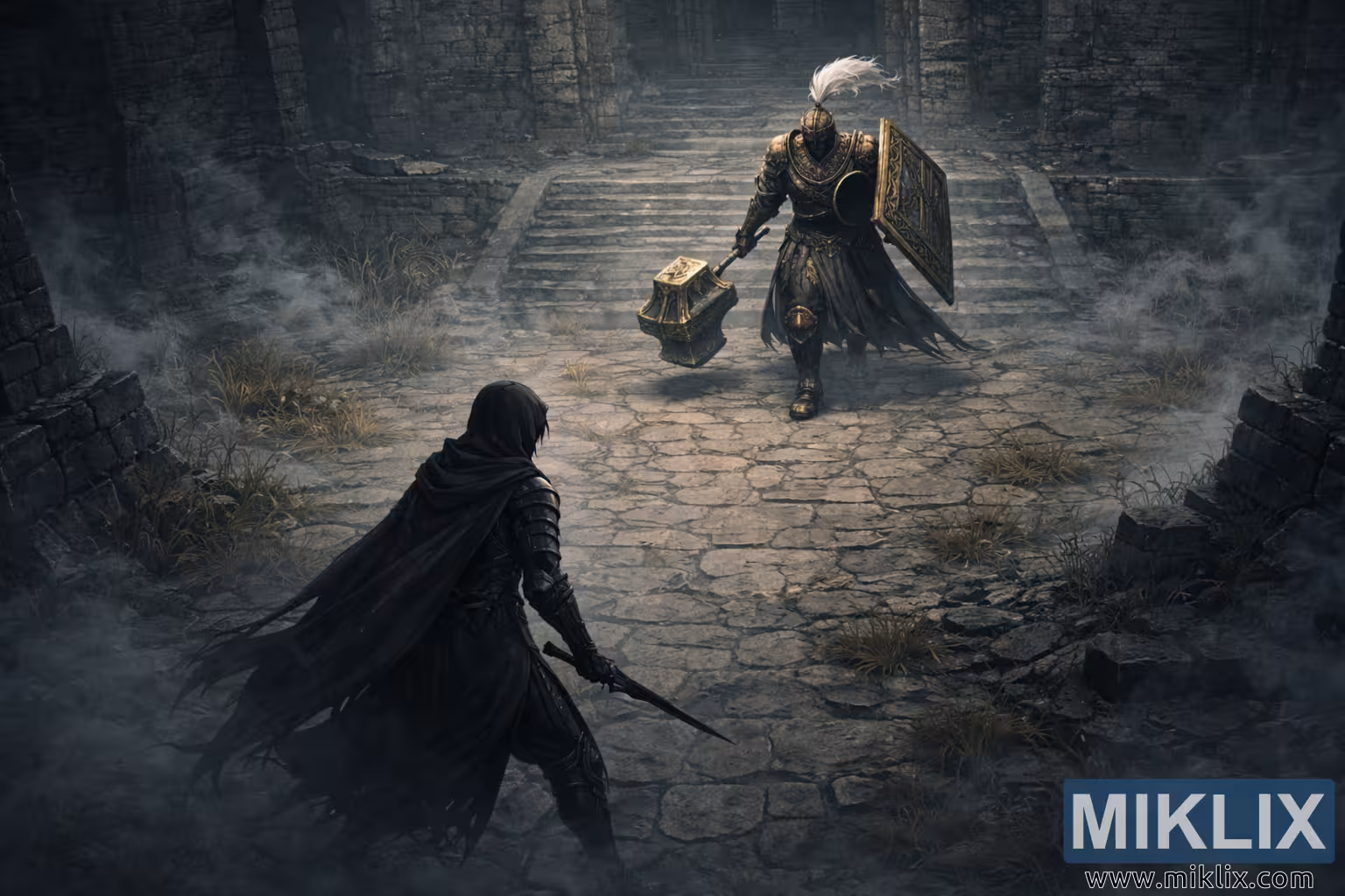The image is related to: Elden Ring: Black Knight Garrew (Fog Rift Fort) Boss Fight (SOTE)