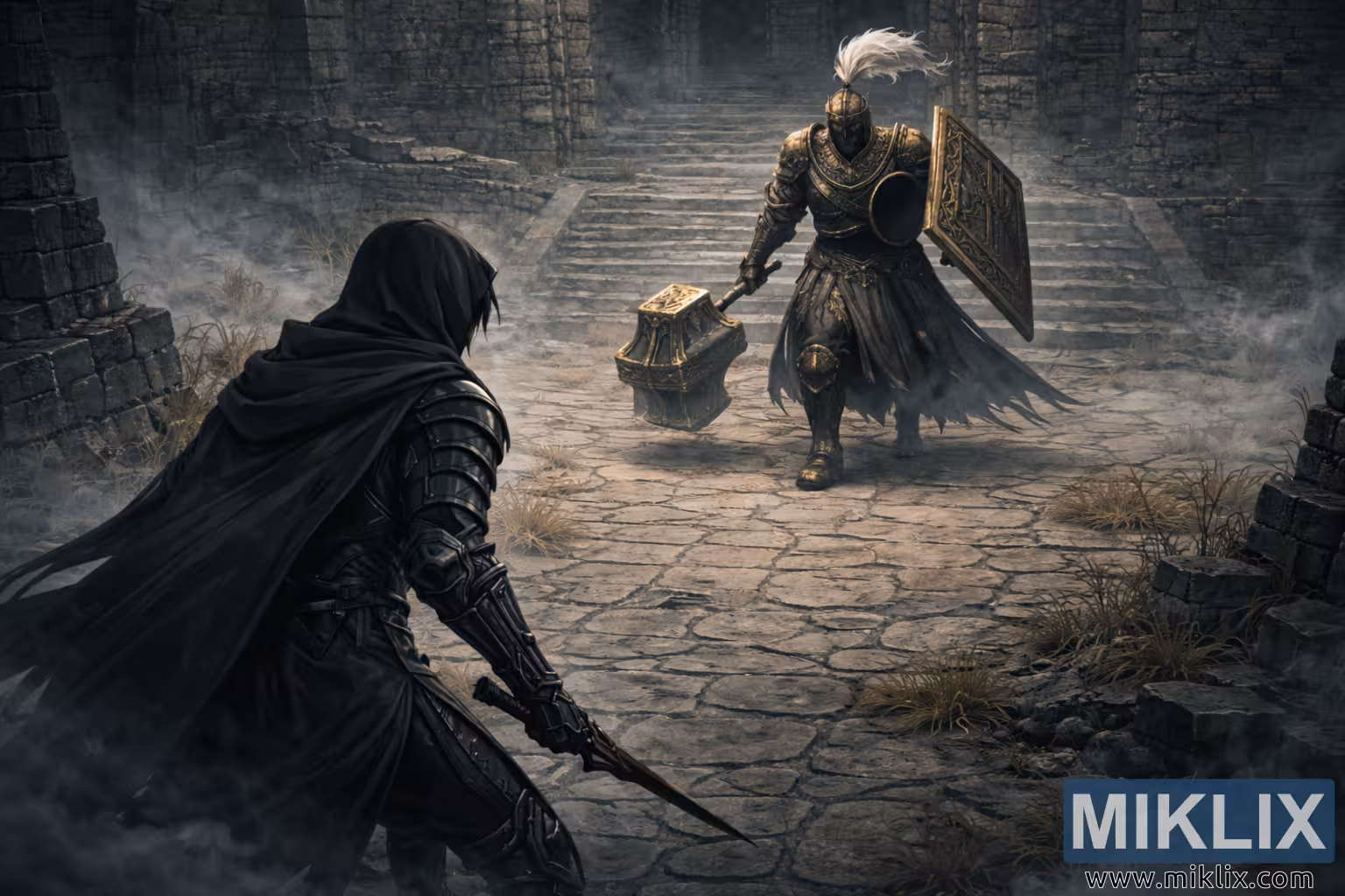Across the courtyard, Black Knight Garrew advances from the base of a broad staircase that rises into the shadowed depths of the fort. He is clad in massive dark armor chased with ornate gold detailing, every plate thick and heavy, suggesting both age and brutal resilience. A white plume bursts dramatically from the crown of his helmet, caught mid-sway as he strides forward. His shield is raised, broad and engraved, while his other arm lets a colossal gilded mace hang close to the ground, its weight bending his posture slightly forward as if eager to crush whatever stands before him.