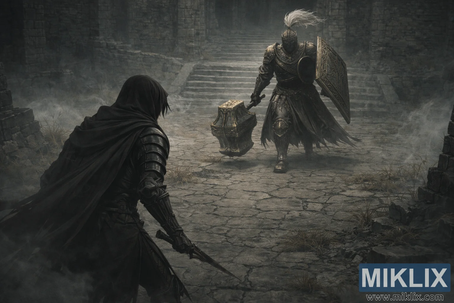 Across the courtyard, Black Knight Garrew advances from the foot of a broad stone staircase. His armor is massive and heavy, layered with dark steel and etched with muted gold filigree that suggests ancient craftsmanship dulled by centuries of war. A stark white plume rises from the crown of his helmet, its motion arrested in mid-sway, standing out sharply against the fog. He carries a thick, engraved shield raised defensively on one arm, while the other grips a colossal gilded mace that hangs close to the ground, its weight apparent in the angle of his stride.