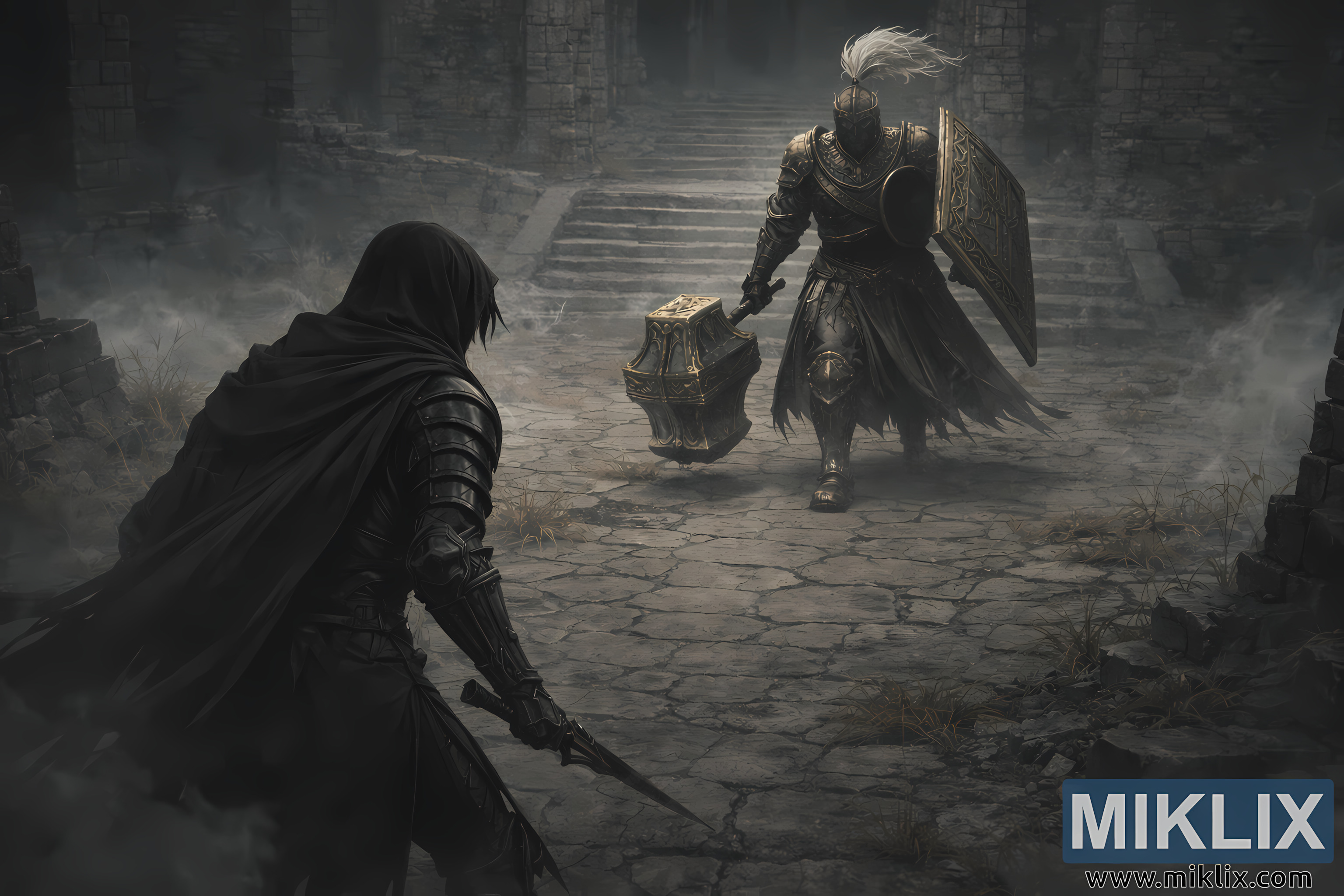The space between the two warriors feels compressed despite the open courtyard, a narrow corridor of silence thick with expectation. The Tarnished’s sleek, shadowed outline contrasts with Garrew’s monumental bulk, setting up a clash between speed and crushing force. There is no flourish or spectacle here, only the grim realism of two combatants closing distance in a place long forgotten by the world. The fog blurs the far walls, the stone steps fade into shadow, and the moment holds like a drawn breath, capturing the calm just before violence tears through the ruins of Fog Rift Fort.