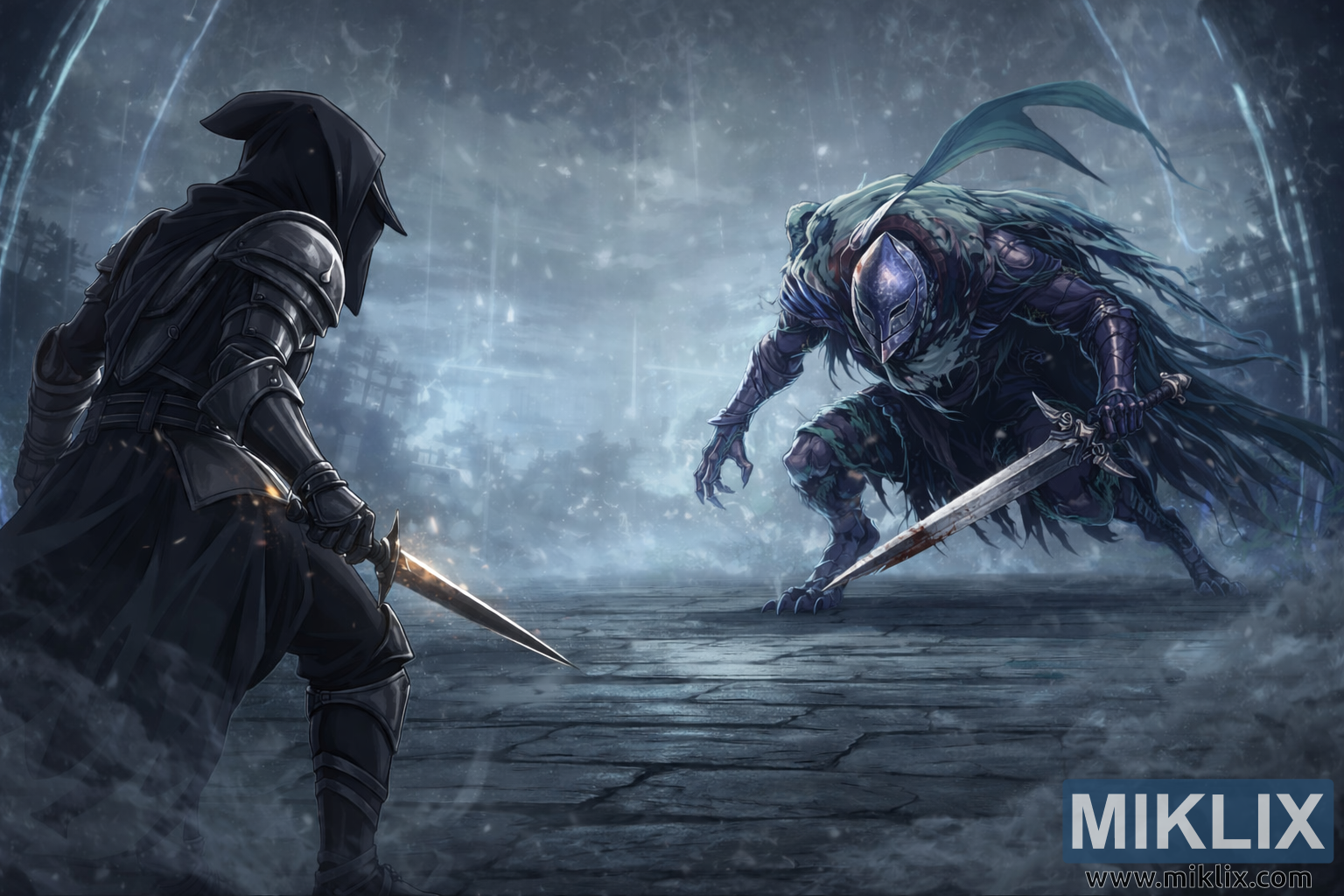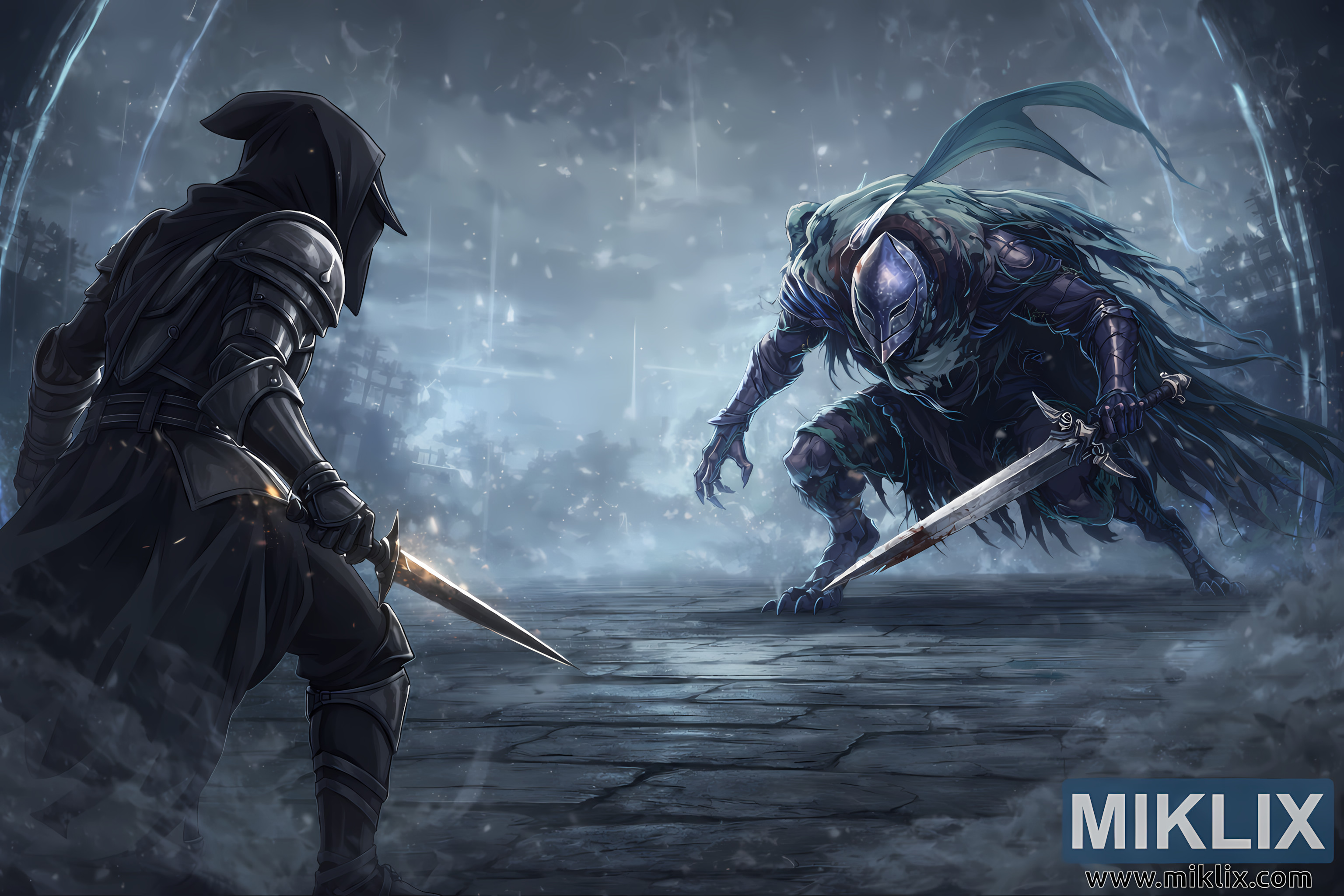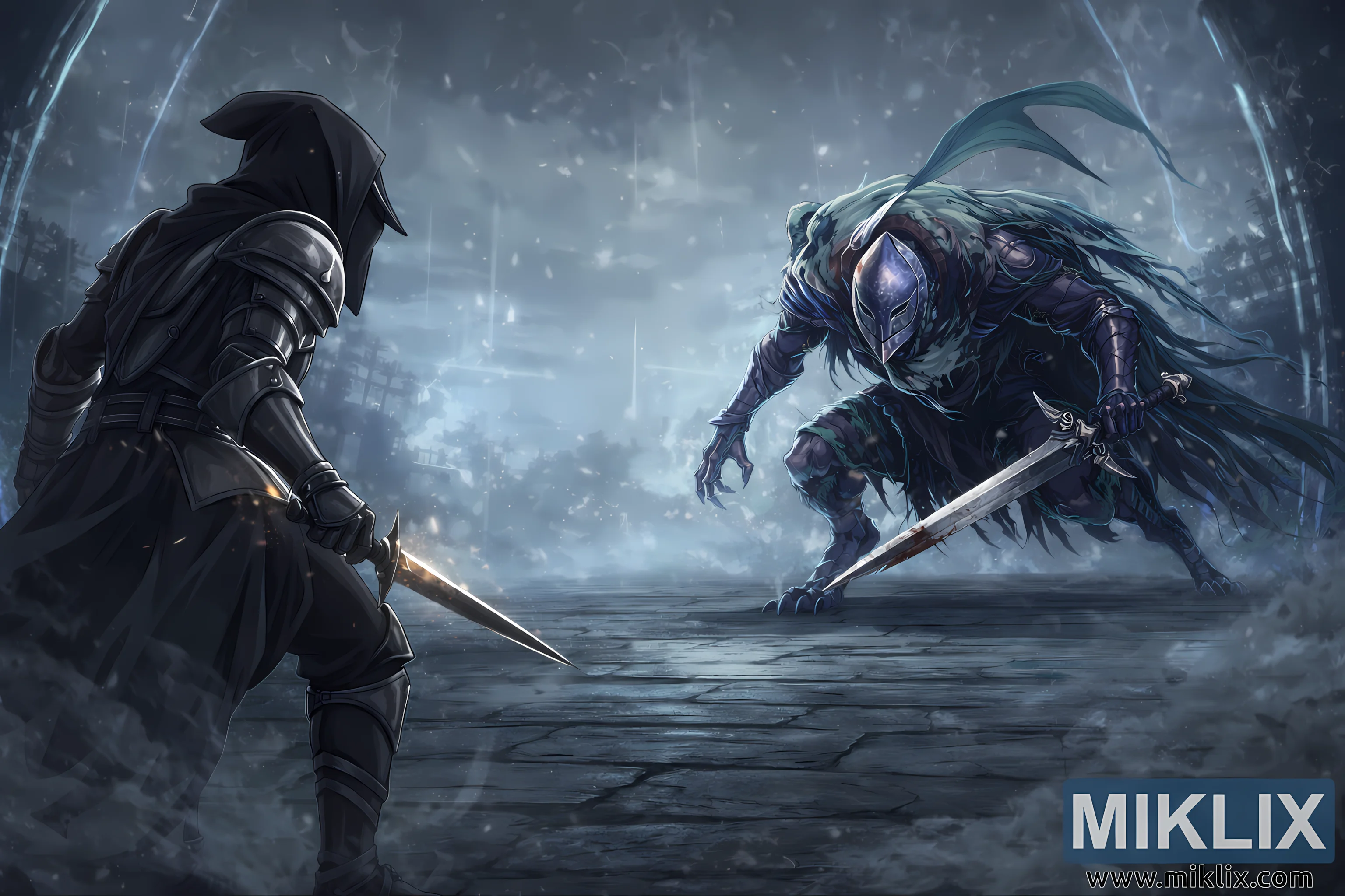 The overall color palette blends icy blues, muted purples, and charcoal grays, punctuated by the warm glint of the Tarnished’s dagger and the faint crimson stains along the knight’s sword. The diagonal composition creates visual tension, with a deliberate empty space between the two warriors symbolizing the thin line separating calm from chaos. Sharp line work, dynamic shading, and dramatic lighting effects enhance the anime aesthetic, resulting in a visually rich tableau that captures the emotional weight of anticipation. The illustration freezes a single breath in time — the instant when both combatants silently measure each other, poised at the edge of inevitable violence yet still suspended in eerie, magical quiet.