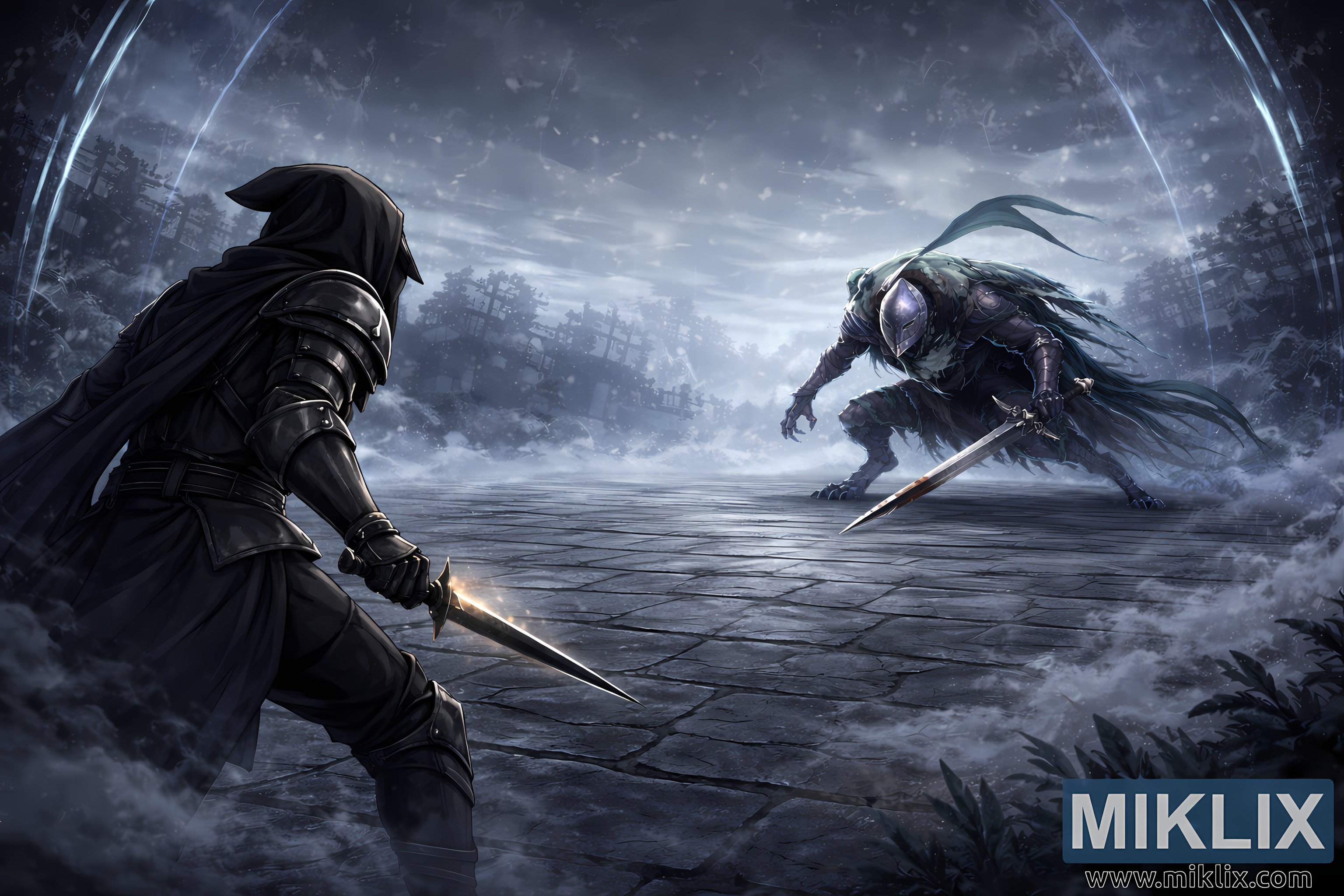 The overall palette blends icy blues, muted purples, and charcoal grays, punctuated by the warm glint of the Tarnished’s dagger and subtle highlights along the knight’s sword. Diagonal composition lines connect the two warriors across an intentional empty space that symbolizes the fragile calm before violence erupts. Crisp anime line work, dynamic shading, and cinematic lighting give the illustration a dramatic, immersive quality. The image captures a single suspended breath in time — the instant just before motion — where silence, magic, and tension coexist in a frozen tableau of impending conflict.