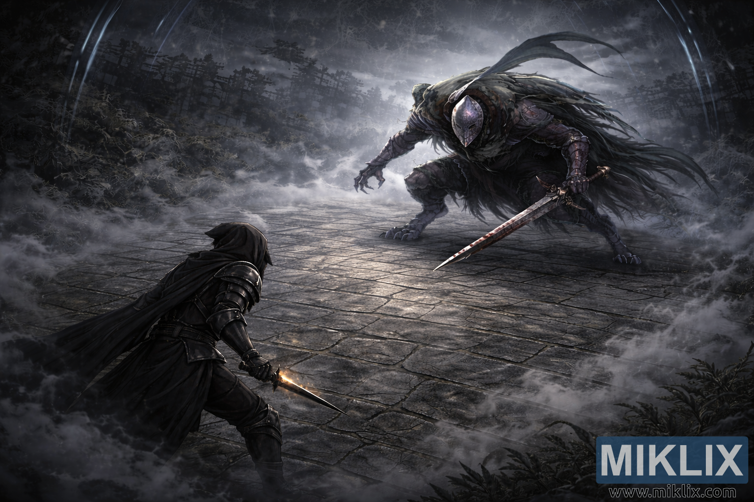 Dominating the mid-ground toward the upper right is the Bloodhound Knight Darriwil, noticeably larger in scale and positioned closer to the Tarnished, heightening the sense of looming threat. From the elevated perspective, the knight’s low, animalistic crouch and elongated limbs form a powerful diagonal silhouette across the stone floor. Battle-worn armor layered with torn cloth and fur-like textures flows behind the figure, rendered with painterly realism rather than exaggerated outlines. In one hand, the knight grips a long, jagged sword angled downward, its edge catching pale reflections and faint dark stains that imply past conflict without graphic detail. The helmet’s narrow visor emits a dim violet glow that draws the viewer’s attention and lends the figure an unsettling, inhuman presence. Wisps of fog wrap around the blade and legs, blending the knight into the spectral environment while preserving a sharp, menacing outline.