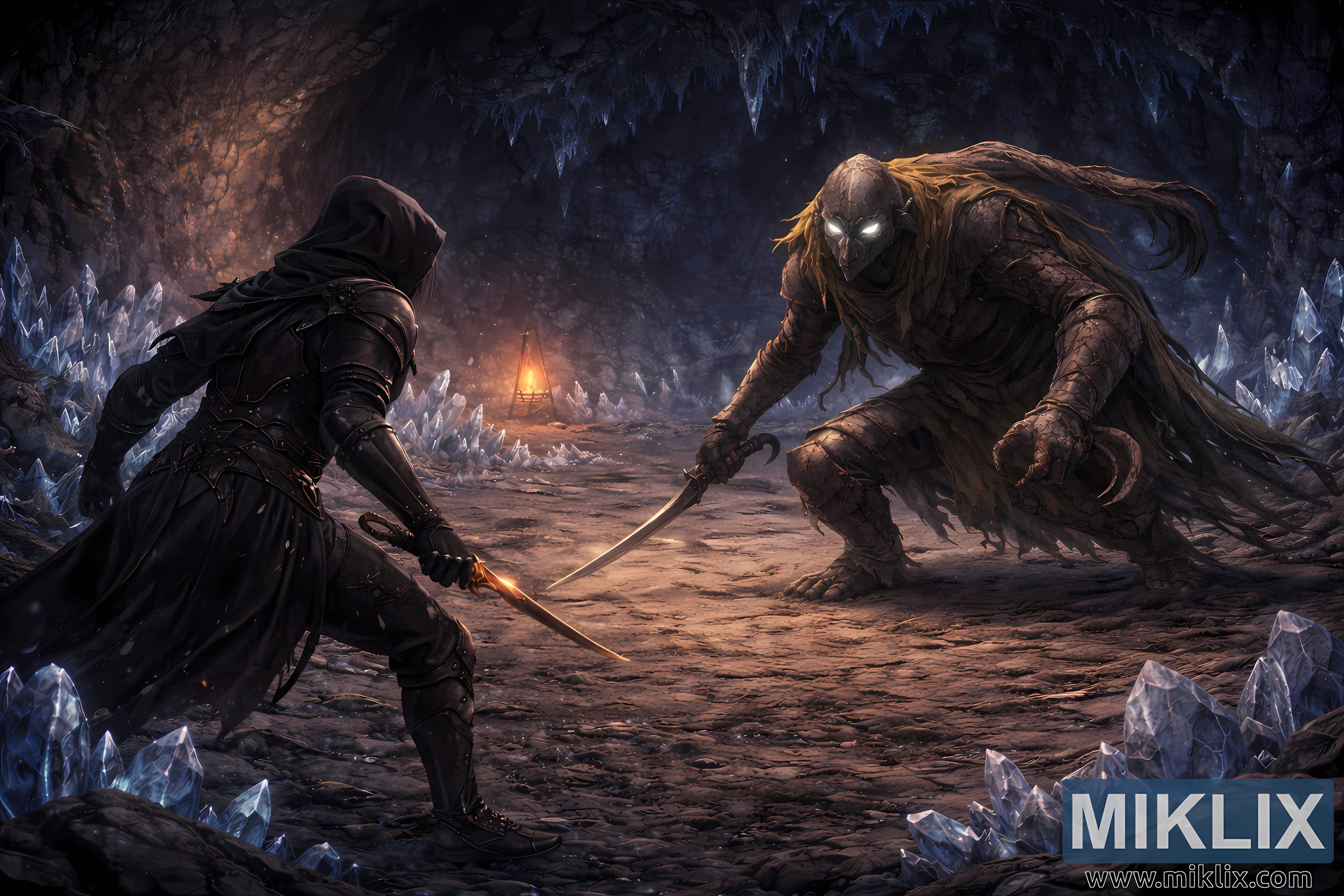 A single lantern burns in the mid-background, placed slightly off-center. Its warm orange flame contrasts strongly with the cold blue illumination of the crystals, creating layered lighting that defines depth and mood. The lantern’s glow softens the shadows near the center of the scene while allowing the edges of the cavern to fade into darkness. Long, natural shadows stretch outward from both combatants, anchoring them firmly to the ground and enhancing the realism of the scene.