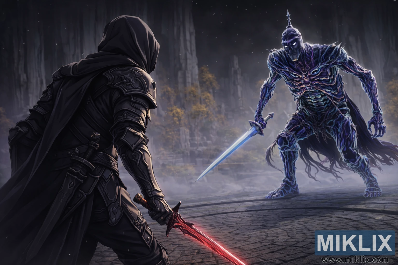 The lighting throughout the scene is subdued and atmospheric, dominated by cool blues, purples, and grays. The contrast between the Tarnished’s red blade and Bols’s blue sword visually reinforces the opposing forces at play. The empty space between the two figures is charged with anticipation, capturing the precise moment before combat begins—a silent breath where both warriors measure one another, embodying the dread, resolve, and solemn grandeur of an Elden Ring boss encounter frozen in time.