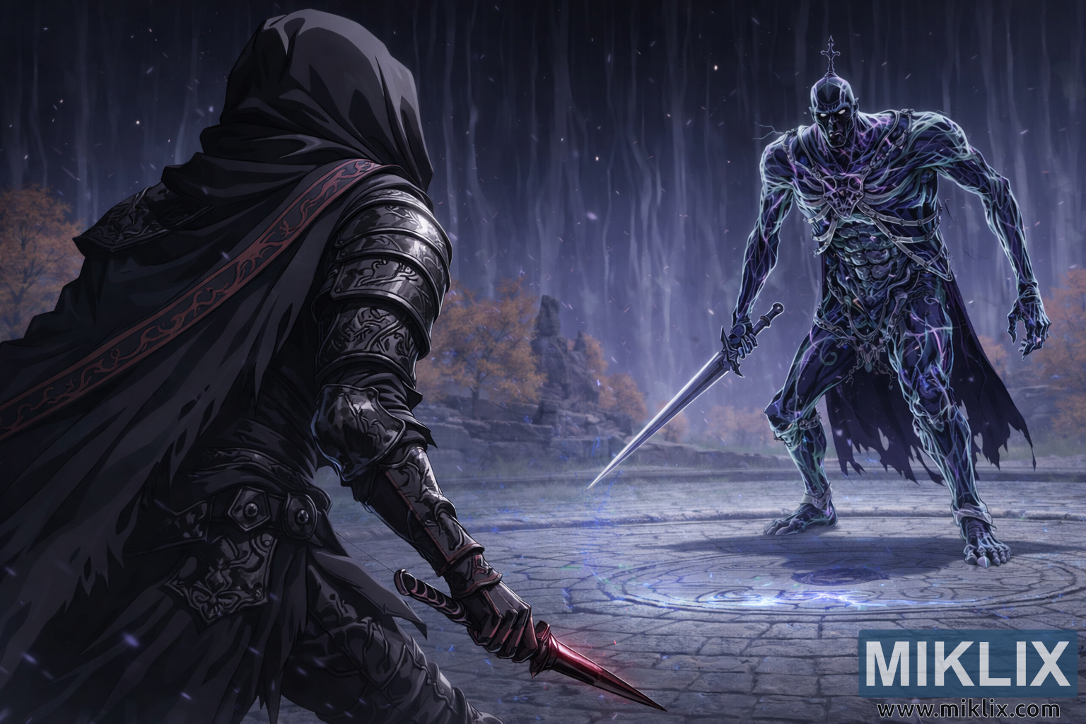 Lighting and color contrast heighten the drama of the scene. Cool blues and purples dominate the environment and Bols’s aura, while the Tarnished’s red-glowing dagger provides a sharp, aggressive counterpoint. This interplay of color draws the eye between the two figures and visually represents opposing forces on the brink of collision. The image freezes a moment of absolute stillness, capturing the wary approach, mutual recognition, and silent challenge exchanged between Tarnished and Carian Knight just before the first strike is made.