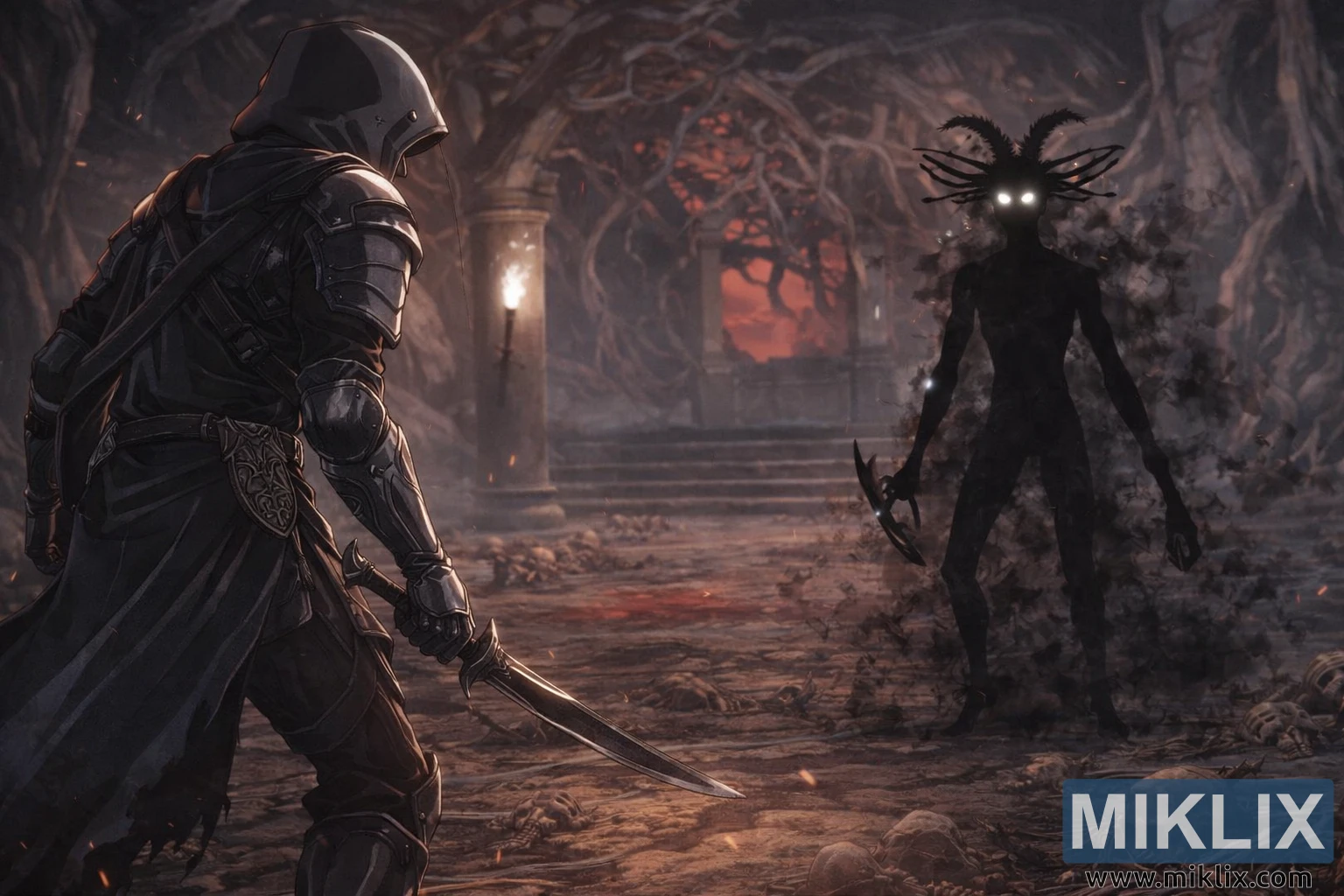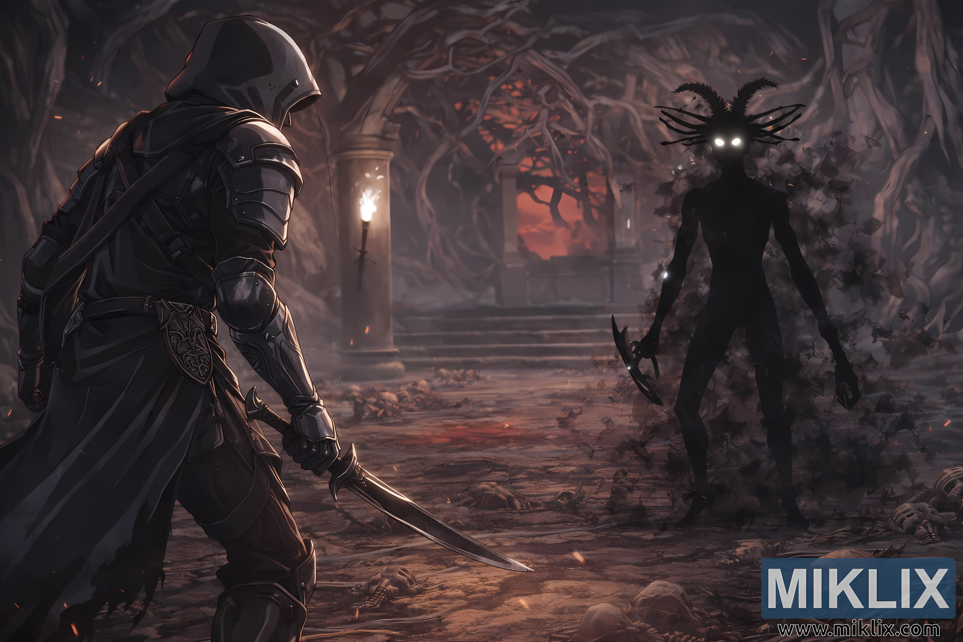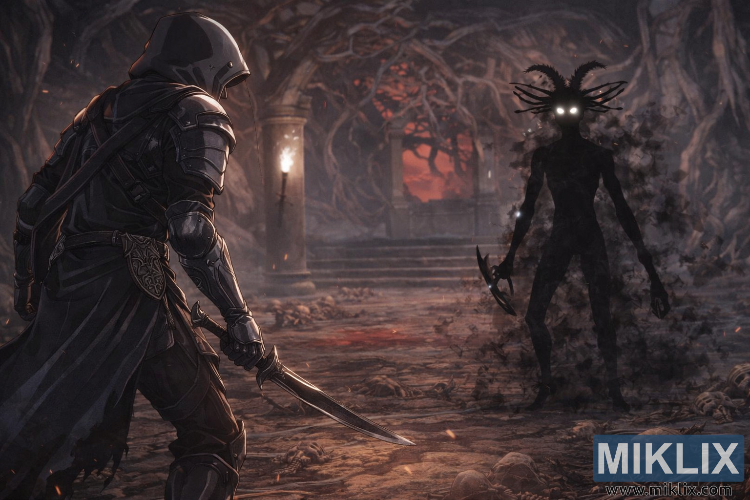 The floor between the two figures is littered with skulls, rib cages, and scattered bones, some half-buried in dust, others piled in small mounds that crunch underfoot. Subtle embers float in the air, catching the light and enhancing the sense of a space charged with malevolent energy. Both combatants are frozen in a wary advance, their stances mirroring one another across the bone-strewn ground, perfectly capturing the breath-holding instant before battle erupts.