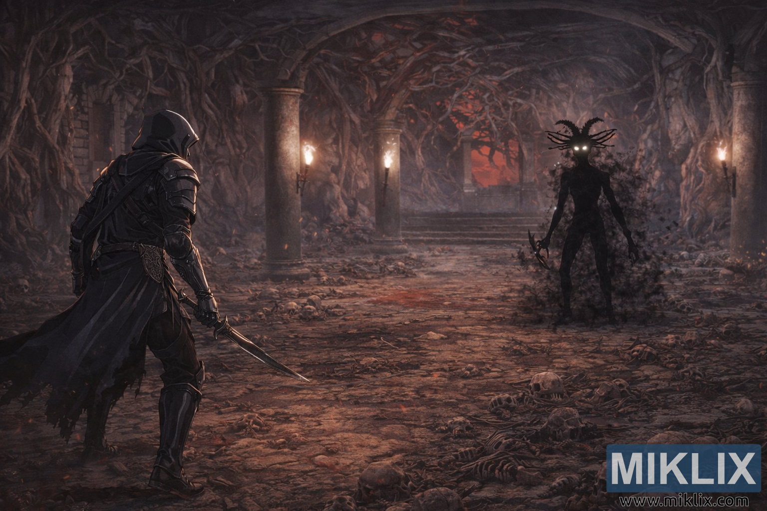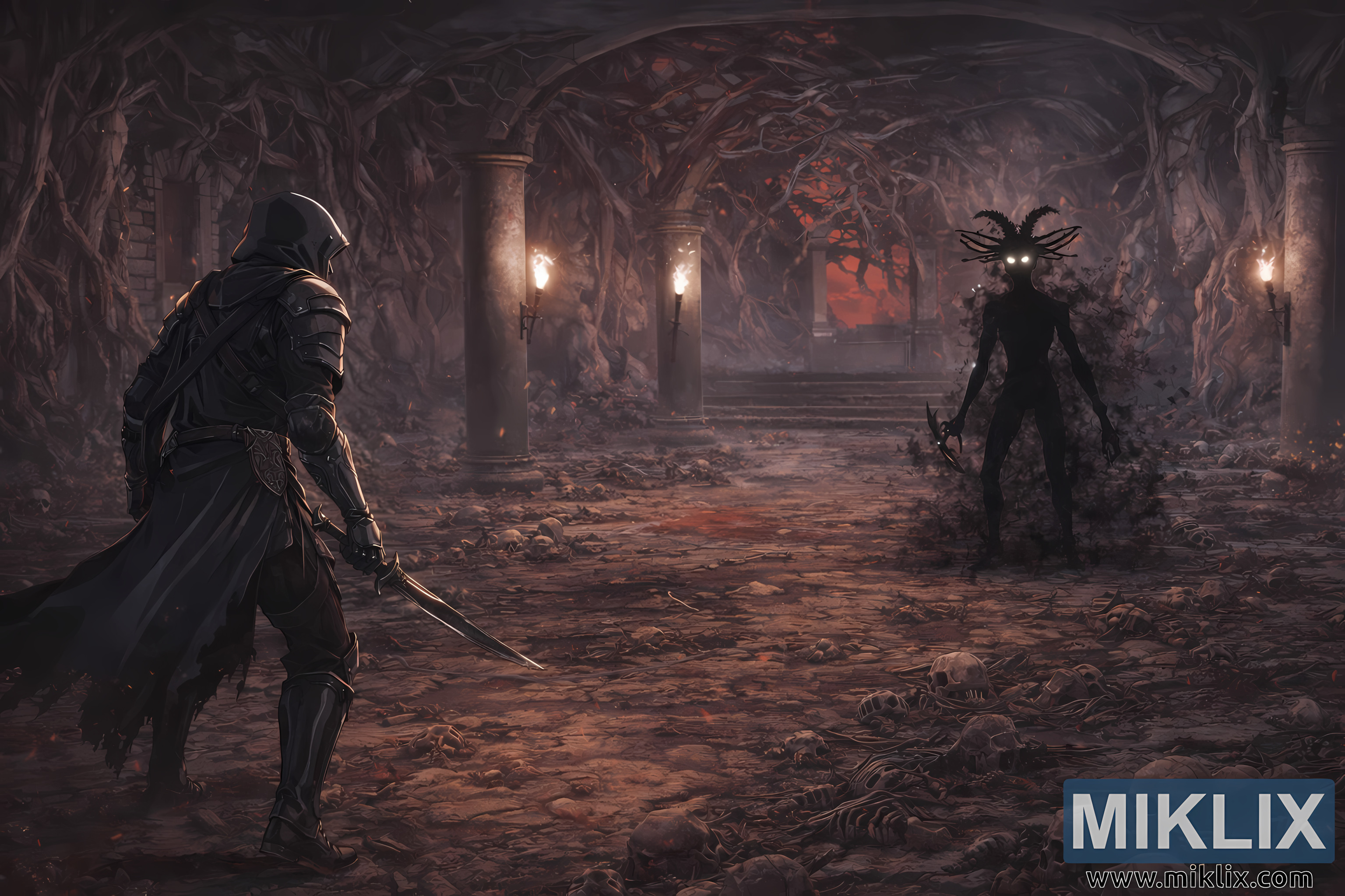 The environment now plays a larger role in the scene. Thick stone pillars rise from the bone-strewn floor, evenly spaced to form a vaulted hall. Each pillar supports arches that are strangled by massive, gnarled roots, which crawl across the ceiling and down the walls like petrified veins. Mounted torches flicker along the columns, their flames casting long, trembling shadows that stretch across the ground and the figures, layering the scene with depth and menace.