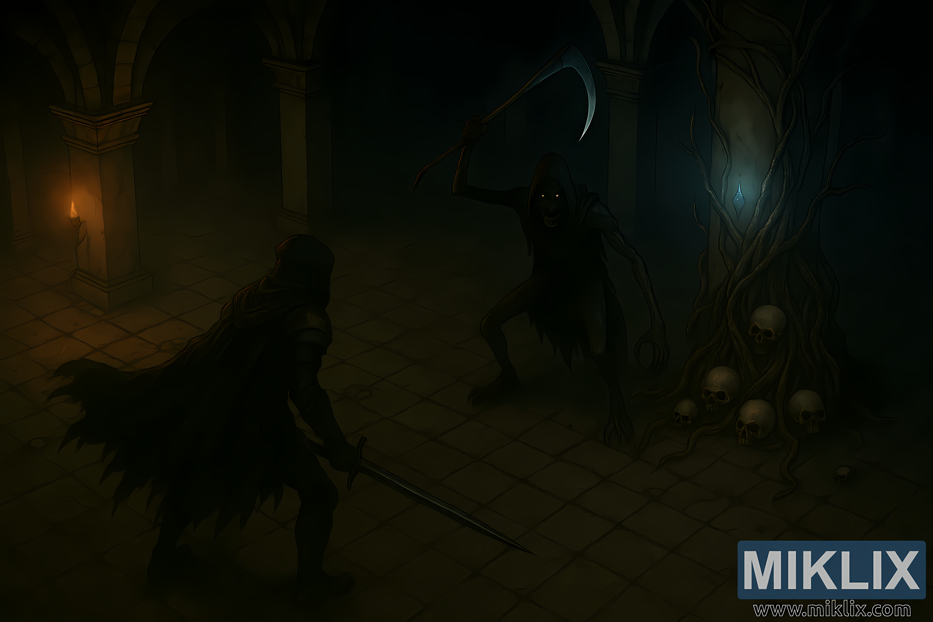 Opposite him, the Cemetery Shade looms in the shadows. Its skeletal frame is draped in a ragged black shroud, with glowing white eyes and a gaping mouth twisted into a grin. It wields a large, curved scythe with a jagged bluish blade raised high in its right hand, while its left arm is extended outward with claw-like fingers splayed. The creature’s posture is hunched and aggressive, its presence amplified by the eerie glow from a nearby pillar.