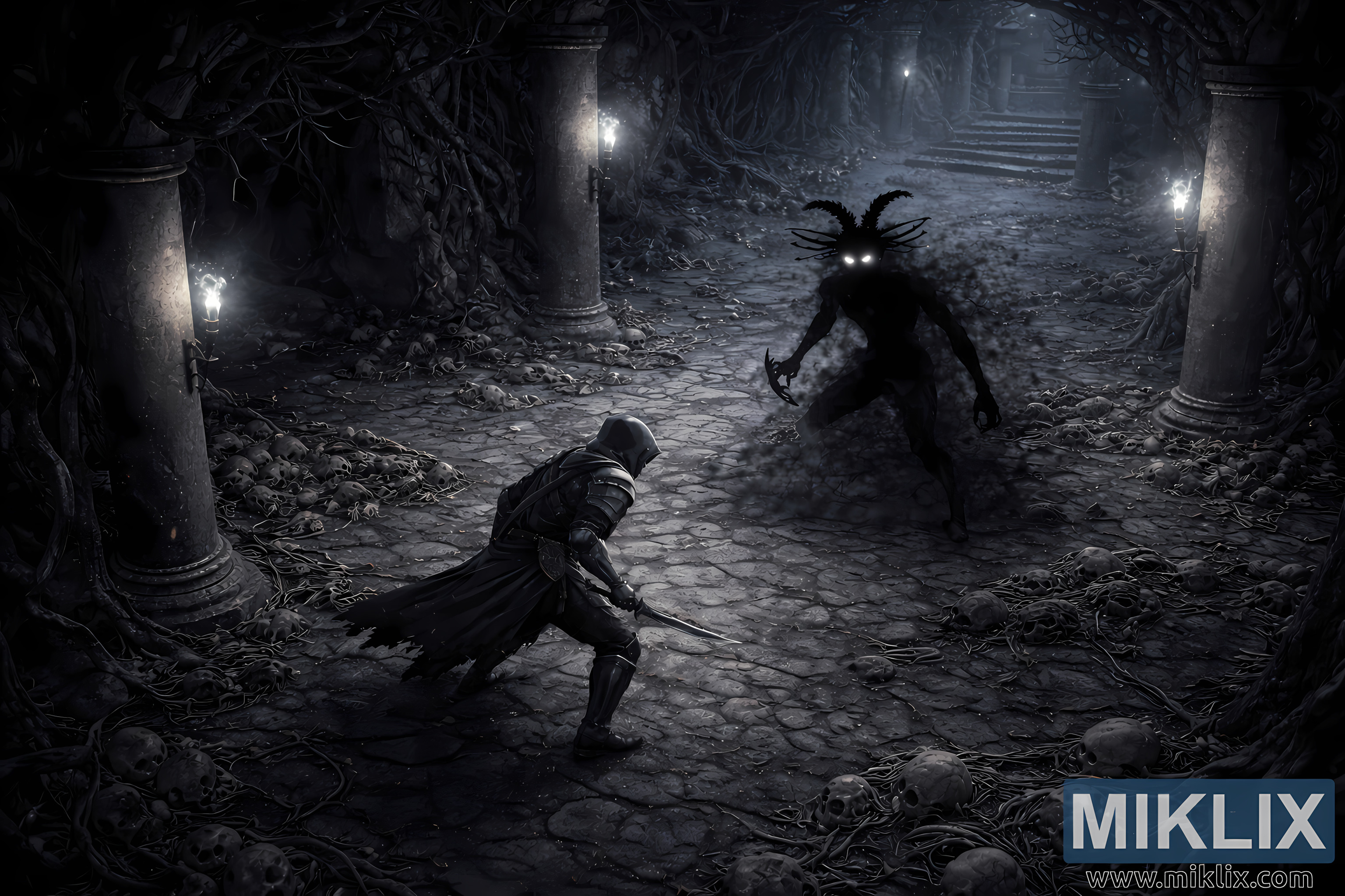 By pulling the camera back and tilting it into an isometric view, the scene becomes less about two figures alone and more about the deadly arena that encloses them. The Tarnished and the Cemetery Shade are now pieces on a cursed board, frozen in the instant before the first move, surrounded by the silent testimony of all who came before and never left.