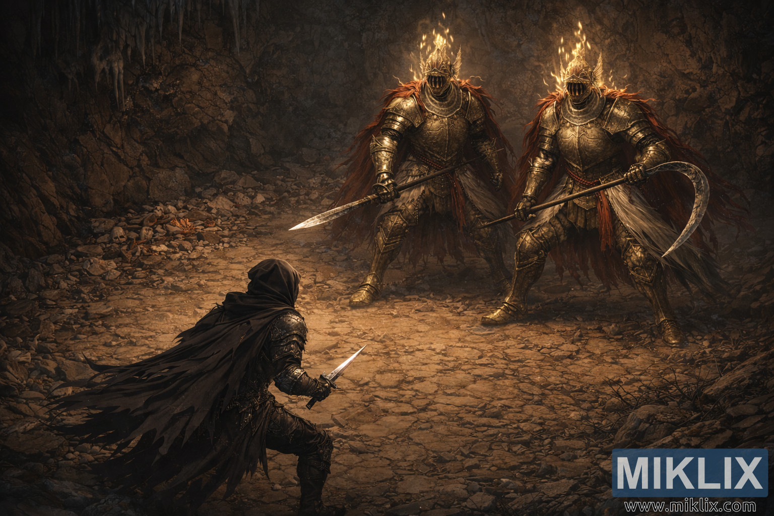 Gritty, less cartoon-like fan art showing the Tarnished facing twin Cleanrot Knights in a dark, bone-strewn cave inspired by Elden Ring.