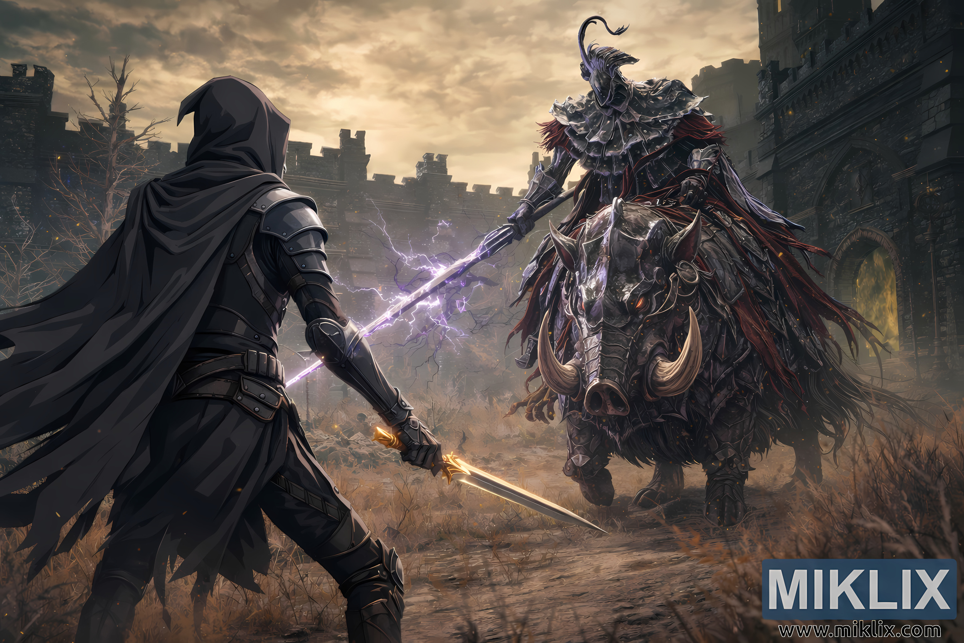 Opposite the Tarnished looms Commander Gaius, an imposing boss figure whose sheer mass dominates the scene. He is mounted atop a colossal armored boar, its body encased in heavy, scarred plating and its massive tusks curving outward like natural siege weapons. The boar’s head is lowered slightly, nostrils flared, as if sensing the imminent violence, while its glowing eyes add a feral intensity to the moment. Commander Gaius sits firmly in the saddle, clad in jagged, battle-worn armor layered with cloth and fur, his silhouette crowned by a distinctive horned helm. He wields a long weapon crackling with purple, lightning-like energy, which arcs through the air and subtly illuminates the space between combatants.
