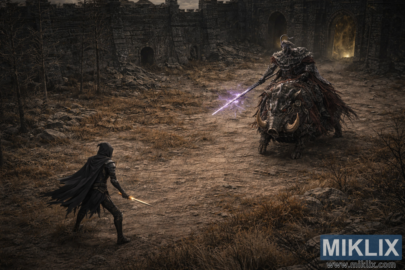 The environment plays a crucial role in the composition. Broken stone walls, collapsed arches, and partially buried doorways encircle the courtyard, their geometry made clearer by the elevated perspective. Dead trees and scattered rubble line the edges of the path between the two figures, guiding the eye toward the inevitable point of collision. The ground is dry, uneven, and littered with debris, rendered in muted browns and grays. Overhead, a dense, overcast sky presses down on the scene, its dull light flattening shadows and reinforcing the bleak atmosphere. The image captures a moment of absolute stillness before violence erupts, where distance, terrain, and intent are all laid bare.