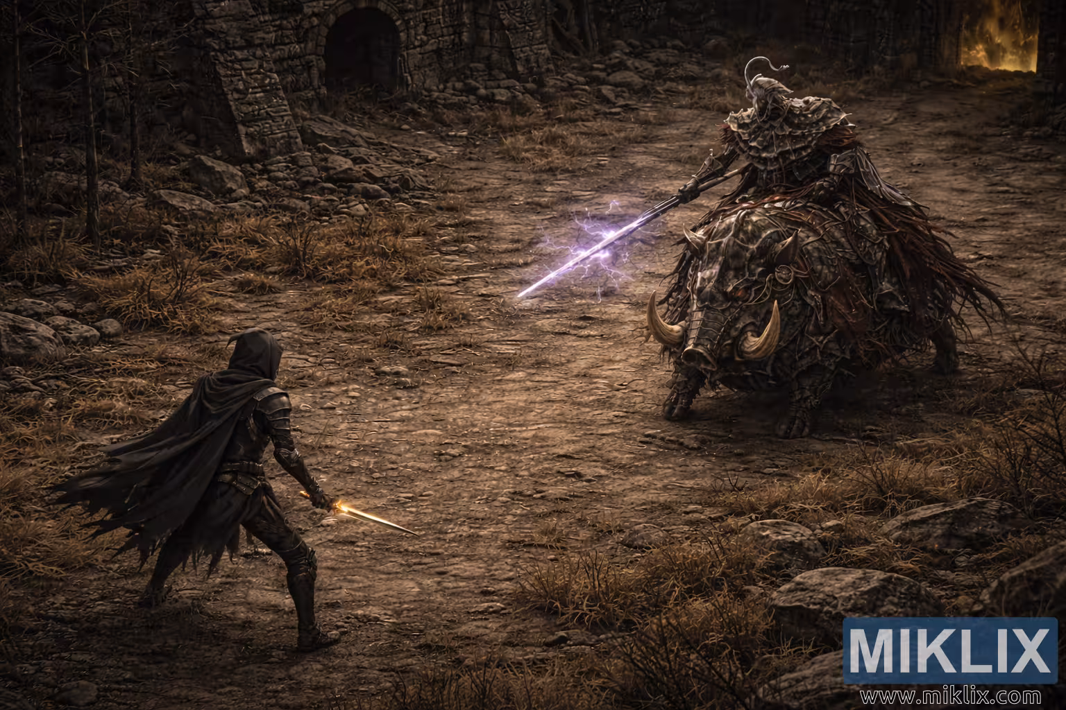 Commander Gaius sits firmly in the saddle, towering above the Tarnished. His armor is heavy and severe, composed of darkened steel layered with torn cloth and coarse fur that hangs in ragged strips. A horned helm fully obscures his face, erasing any trace of humanity and presenting him as an embodiment of brute force and command. He grips a long spear suffused with crackling violet energy. The energy arcs subtly along the weapon’s length, casting faint reflections on nearby armor and stone without overpowering the natural lighting.