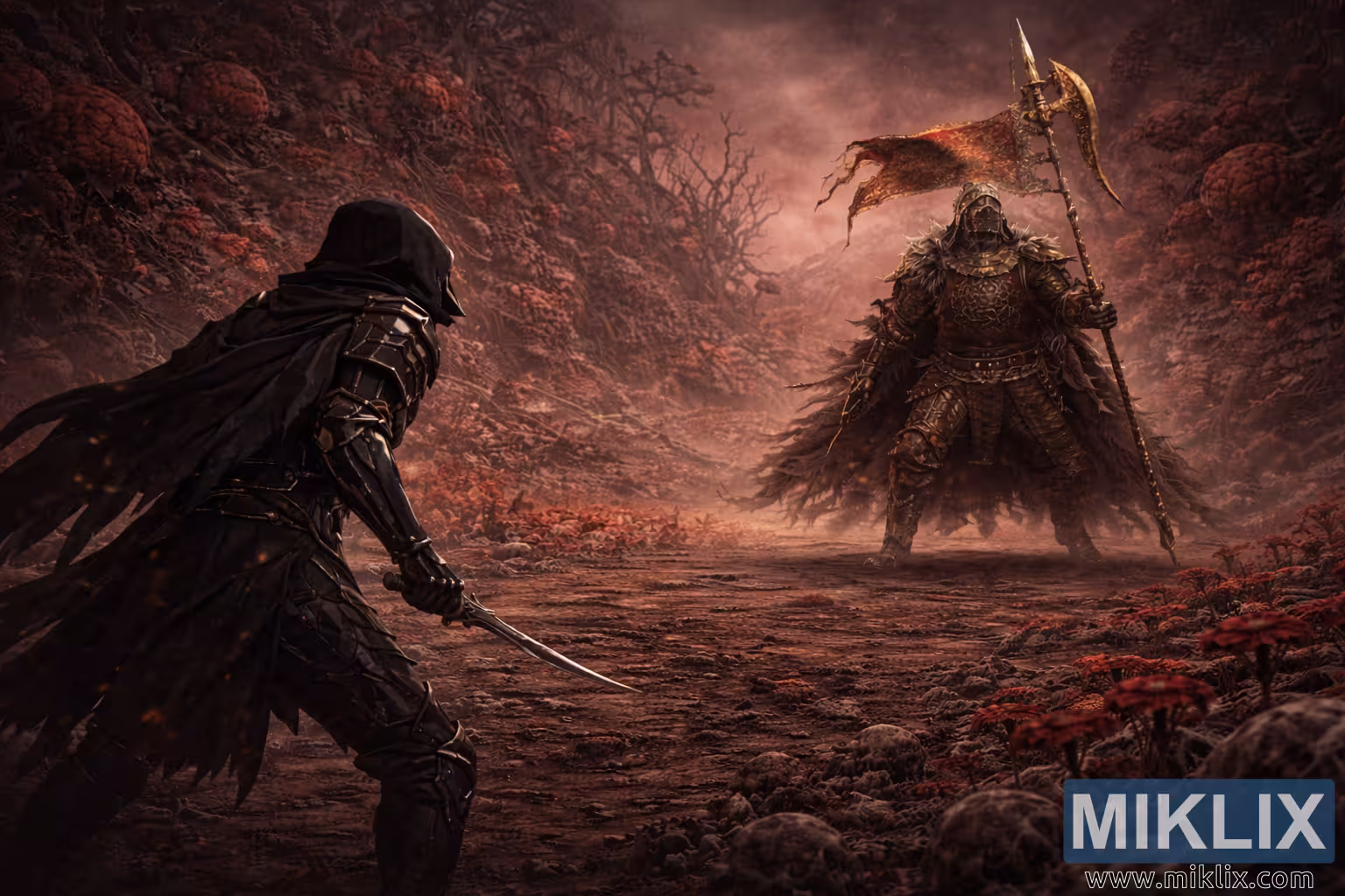 Across the clearing stands Commander O’Neil, enlarged in the composition so that he towers over the Tarnished. His armor is thick, corroded, and layered, with battered pauldrons and ragged feather-like fringes hanging from his cape. He grips a massive halberd whose ornate, gold-edged axe head catches the murky light. A torn crimson banner is fastened beneath the blade, fluttering weakly in the scarlet mist. The banner’s faded patterns hint at lost regiments and forgotten wars, reinforcing O’Neil’s role as a relic of endless conflict. His stance is broad and grounded, boots half-buried in the swamp’s soft, infected soil, conveying the sense of an immovable wall of steel slowly bearing down.