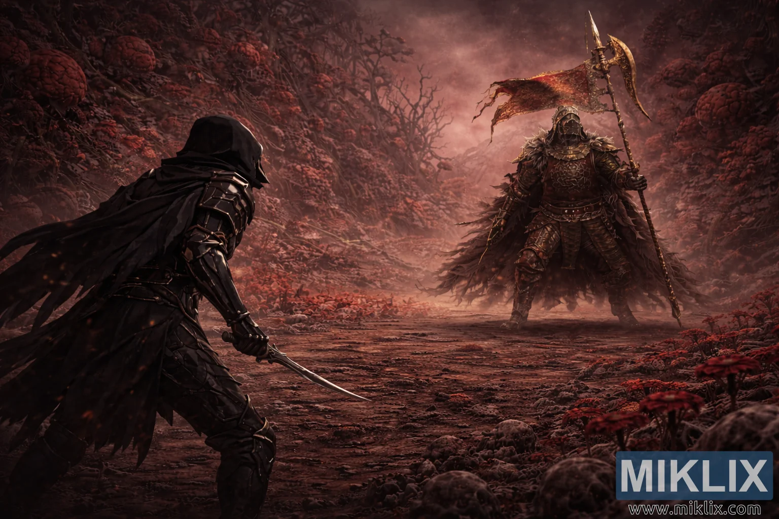 The environment is bleak and oppressive. The valley walls on both sides are crowded with swollen, red fungal growths that resemble diseased coral or petrified organs, while twisted, leafless trees claw at the dim sky. The ground between the combatants is slick with scarlet rot, dotted with low clusters of crimson flowers that glow faintly against the ashen earth. A thick haze hangs in the air, tinted red and purple, and drifting motes of light float between the two figures like embers from some unseen fire.