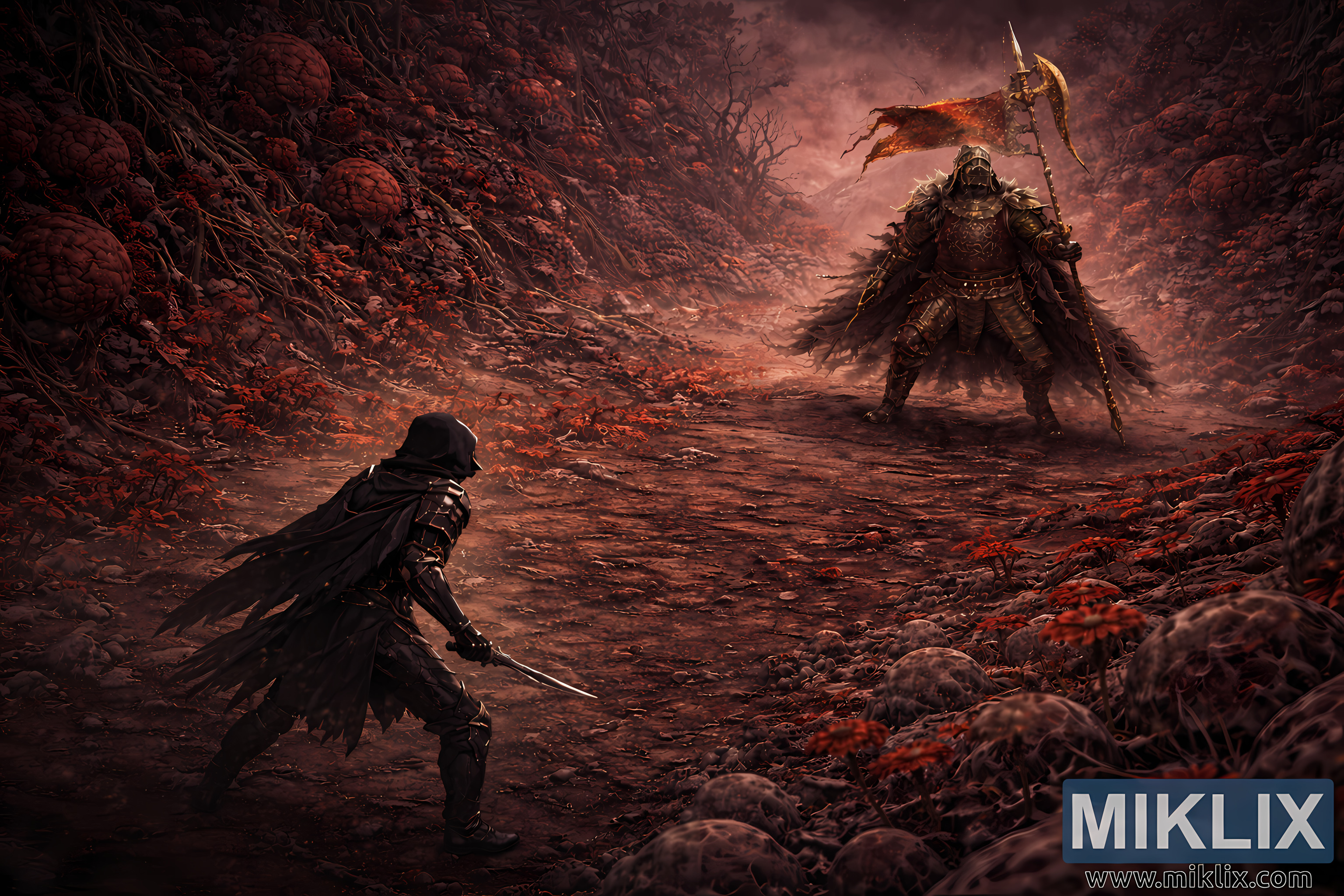 Further up the path, dominating the center-right, is Commander O’Neil. From this elevated angle he appears even more imposing, his massive frame filling the width of the corrupted road. His armor is thick, rust-stained, and layered, with torn, feather-like fringes hanging from his shoulders and cape. He plants a colossal halberd into the ground, its ornate, gold-edged blade catching the dim light. A tattered crimson banner is fastened beneath the axe head, streaming sideways through the haze, its shredded fabric echoing the decay that defines the swamp.