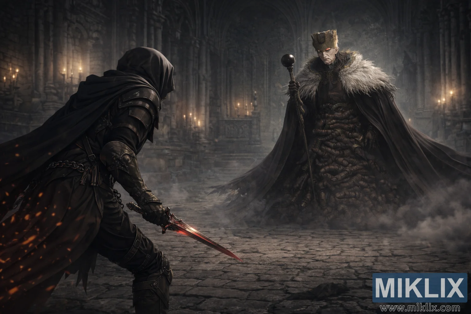The image portrays a dark, semi-realistic fantasy confrontation inside an immense gothic cathedral, emphasizing atmosphere and weight over stylization. The camera is pulled back to reveal a broader view of the environment, allowing the architecture and space to frame the impending conflict. Towering stone columns rise on either side, their surfaces scarred by age and shadow, while high ribbed arches disappear into darkness above. The air is thick with drifting mist that clings to the floor and curls around the figures’ feet, softening the hard edges of the cracked stone tiles. Sparse candles burn along distant walls and near a raised altar, their warm light barely piercing the cold, gray-blue gloom that dominates the hall.
